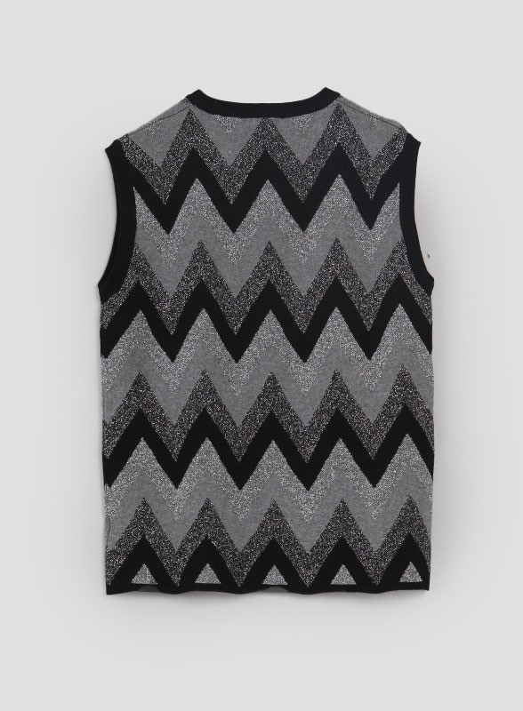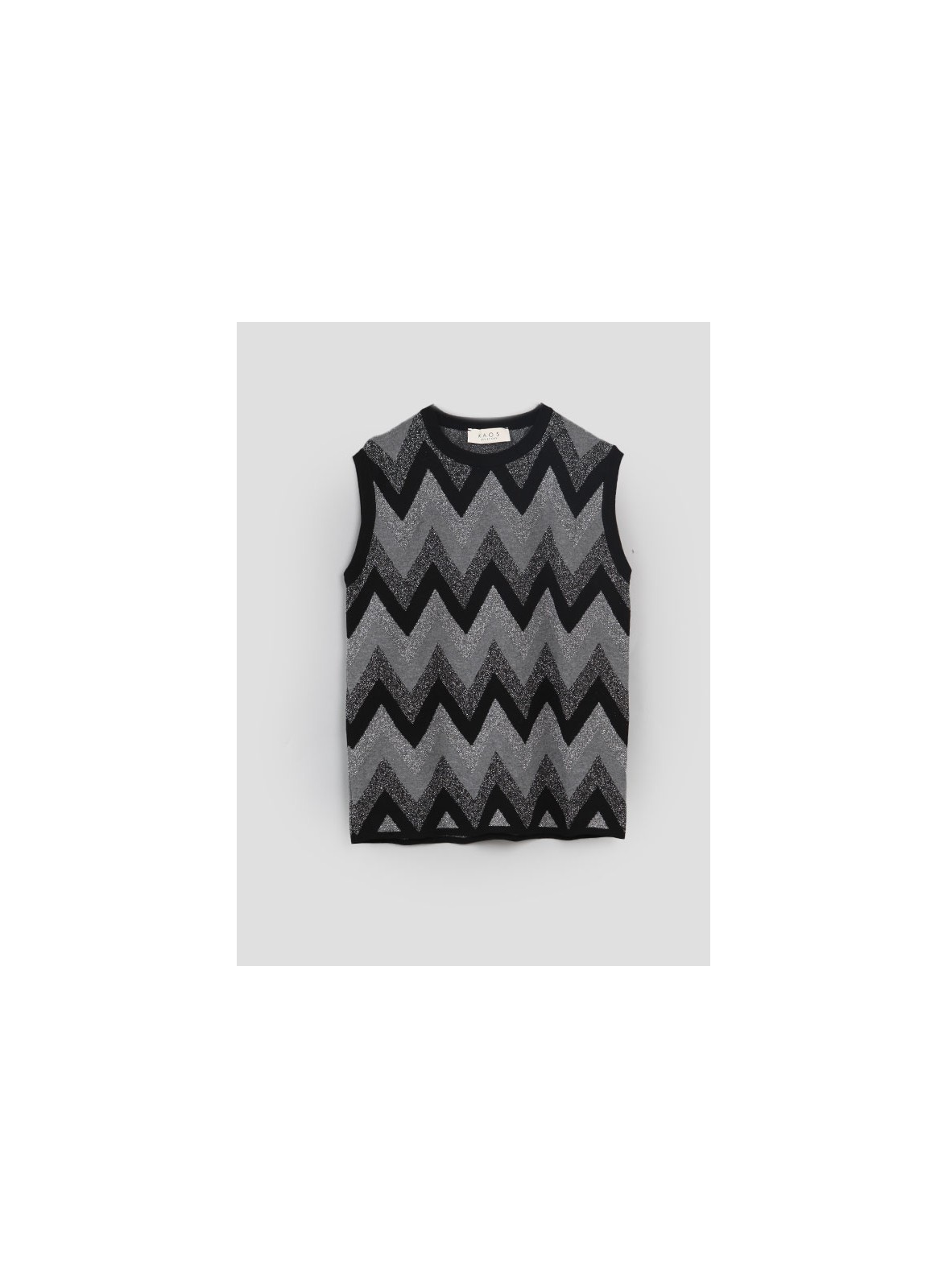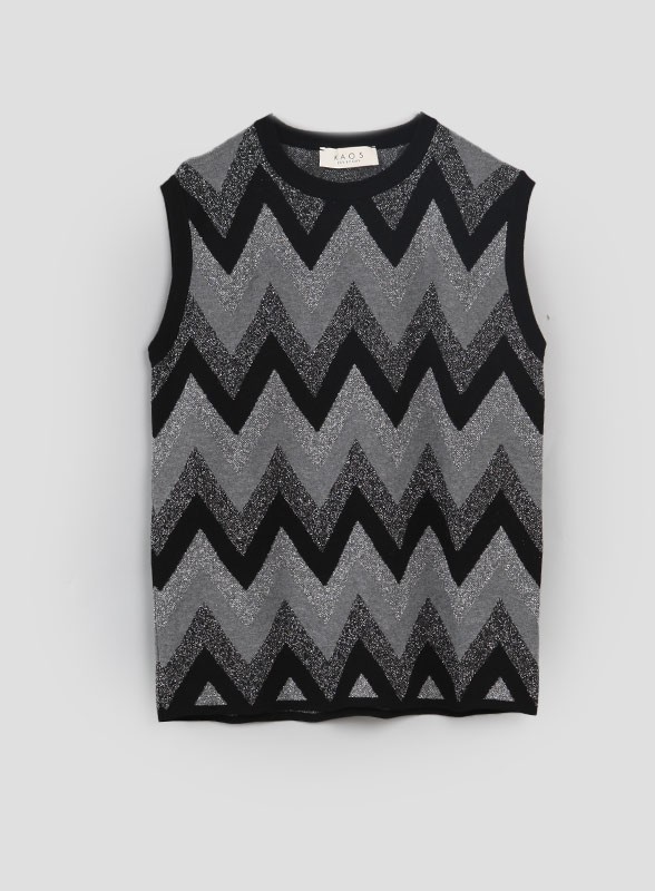 Tunica firmata KAOS, effetto gilet a girocollo con lavorazione in lurex a motivo zig zag. Senza bordo al fondo. Vestibilità comoda.