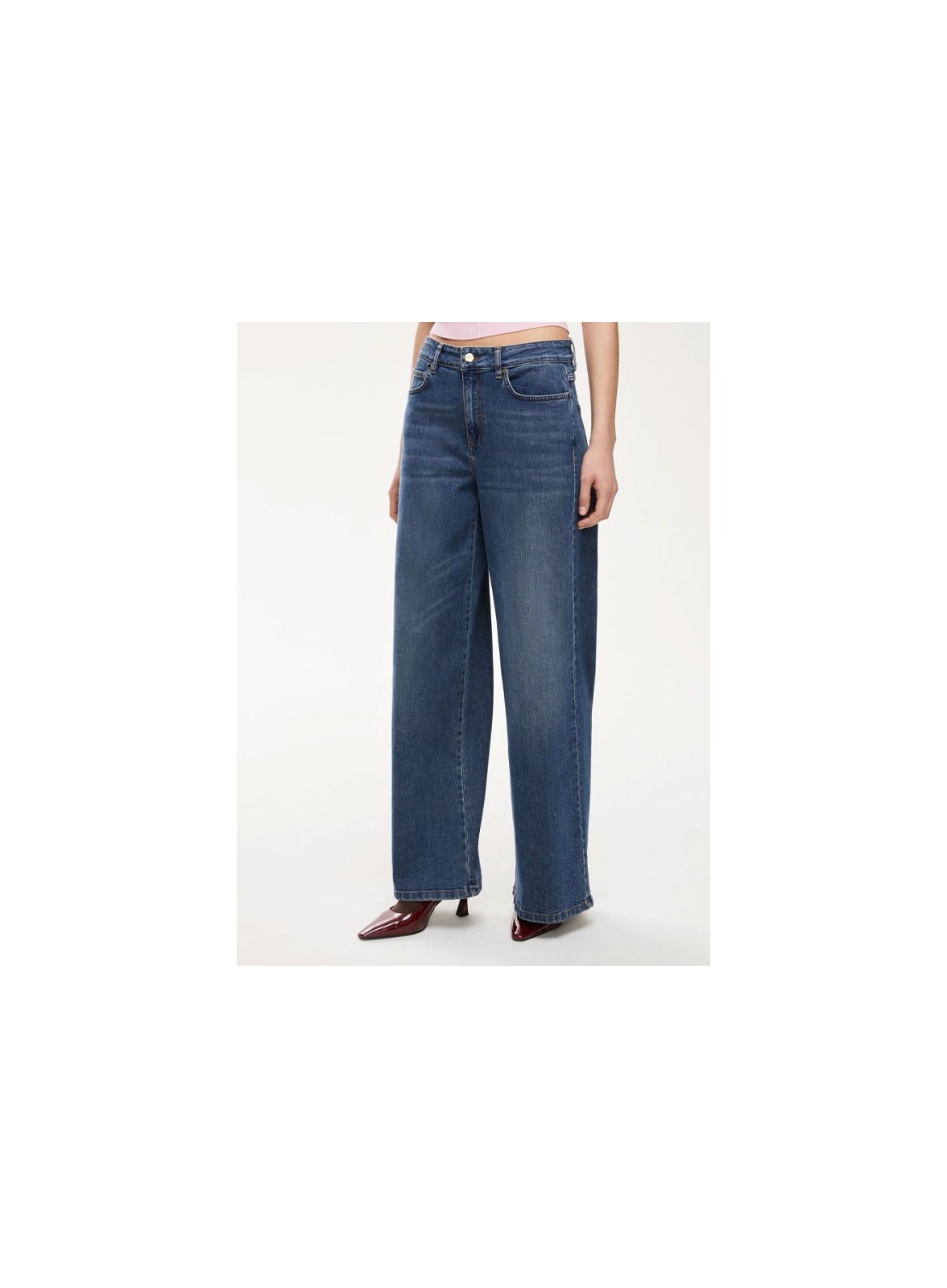 Jeans firmati IBLUES, cinque tasche, linea wide leg in denim cotone stretch, fit ampio e confortevole, perfetti per uno stile casual elegante.