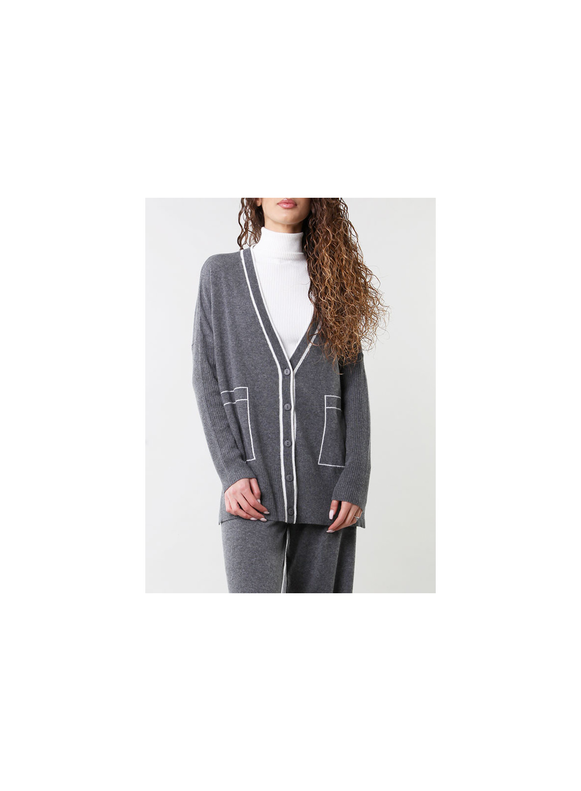 Cardigan abbottonato, manica lunga con giro sceso e tasche applicate sul davanti della nuova collezione FW23.