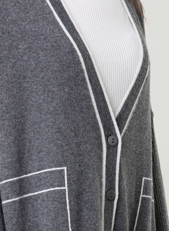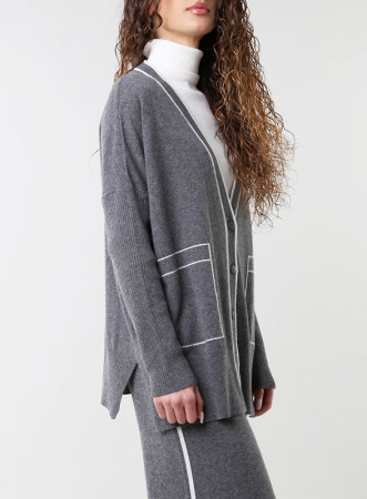 Cardigan firmato Kontatto: eleganza contemporanea con riga laterale a contrasto, tasche applicate e vestibilità regolare.