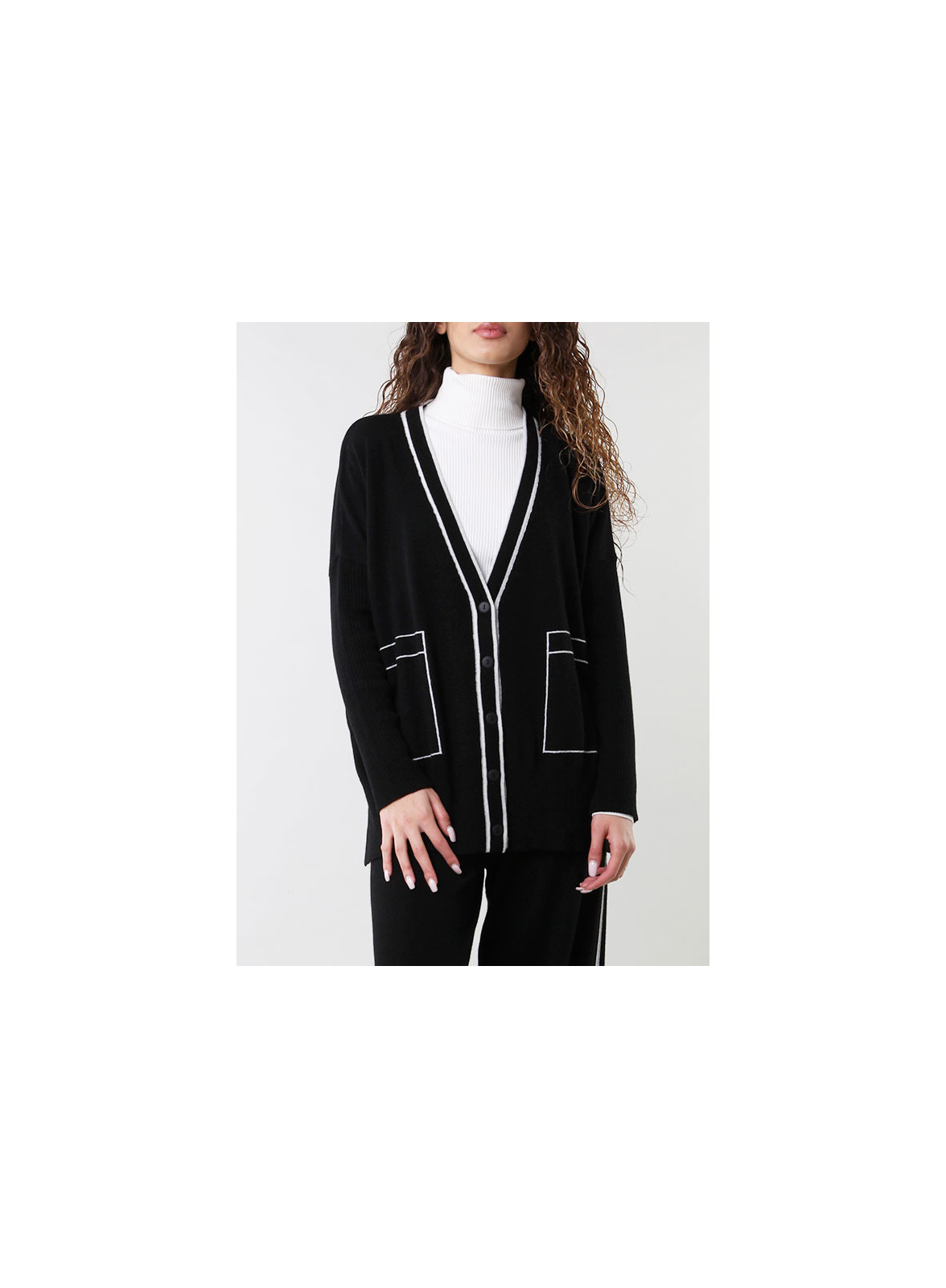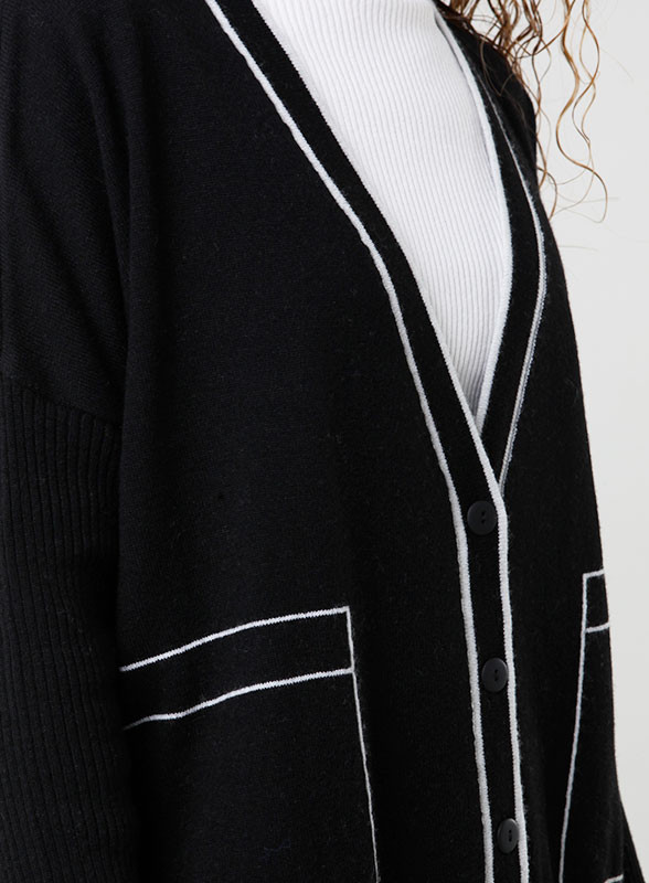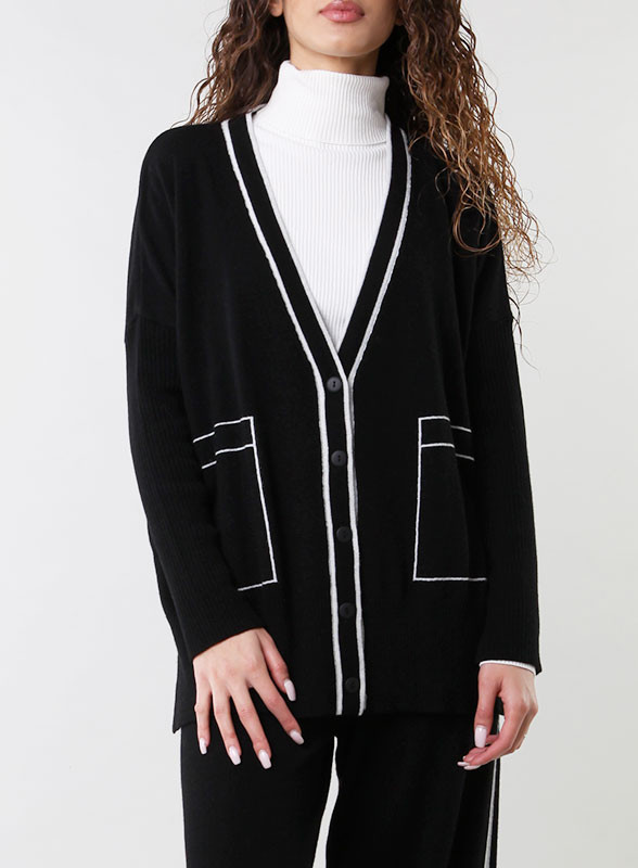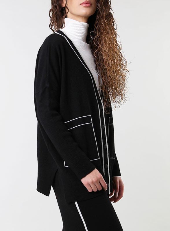Eleva il tuo stile con il cardigan firmato Kontatto: riga laterale a contrasto, tasche frontali e vestibilità regolare.