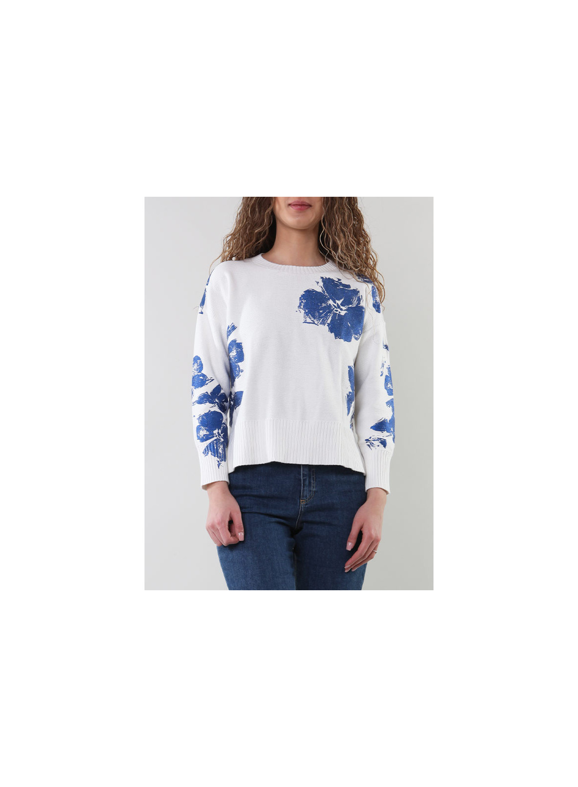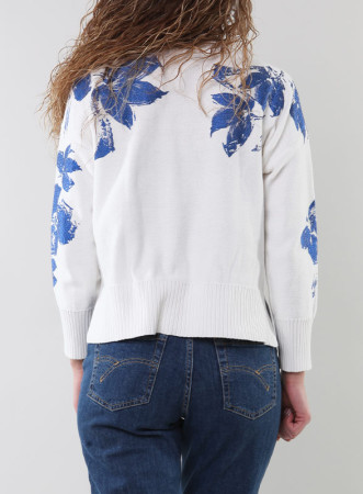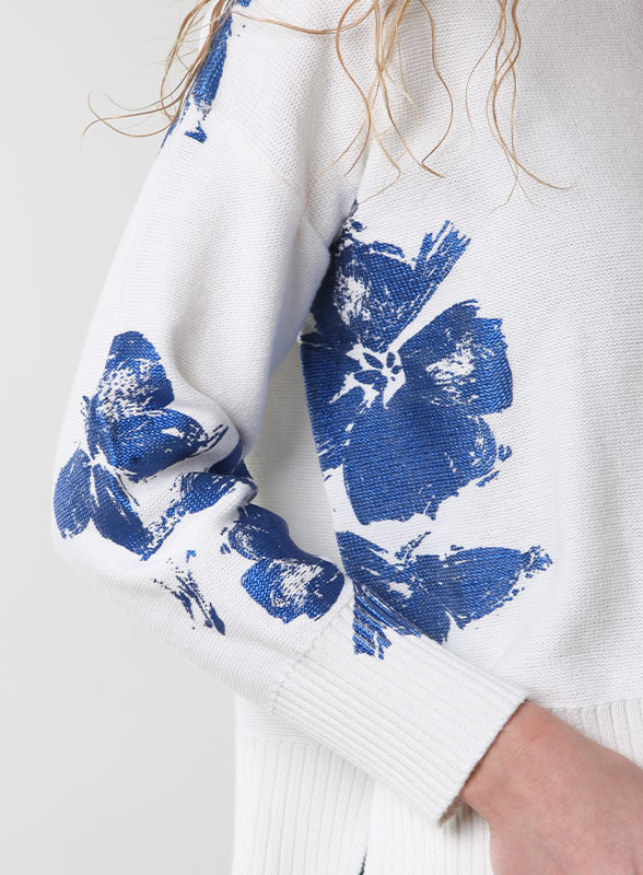 Il fondo bianco è illuminato da una delicata stampa floreale azzurra, mentre la lavorazione rasata offre comfort e stile. Con collo a giro e maniche lunghe con polsini alti, presenta un taglio regolare con spacchetti laterali per una vestibilità comoda.