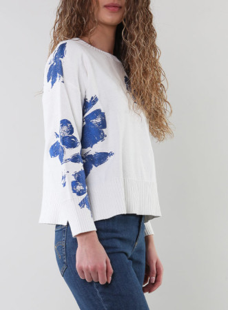 Maglia cotone firmata Marella, fondo bianco, fiori azzurri della collezione SS24.