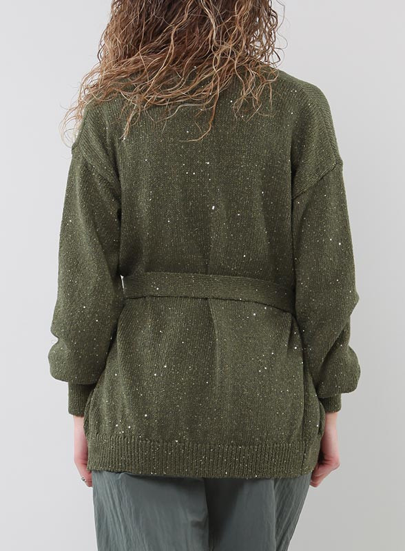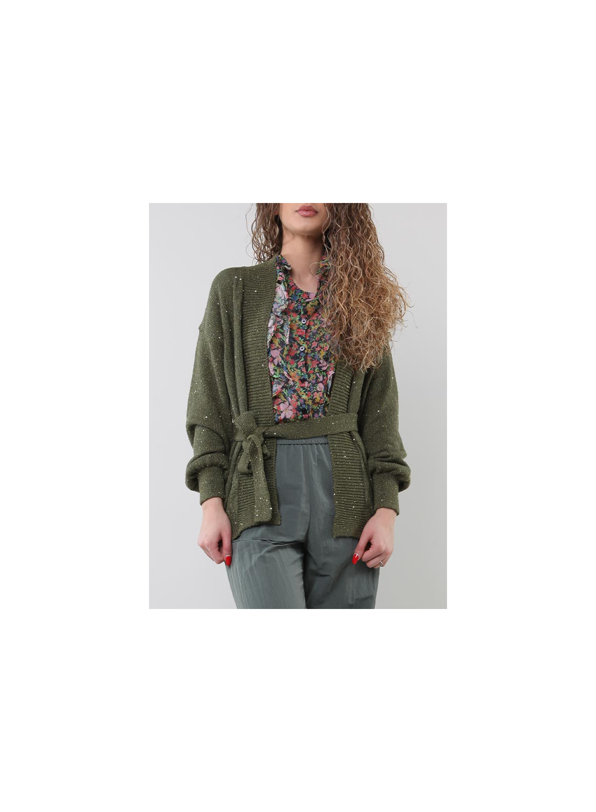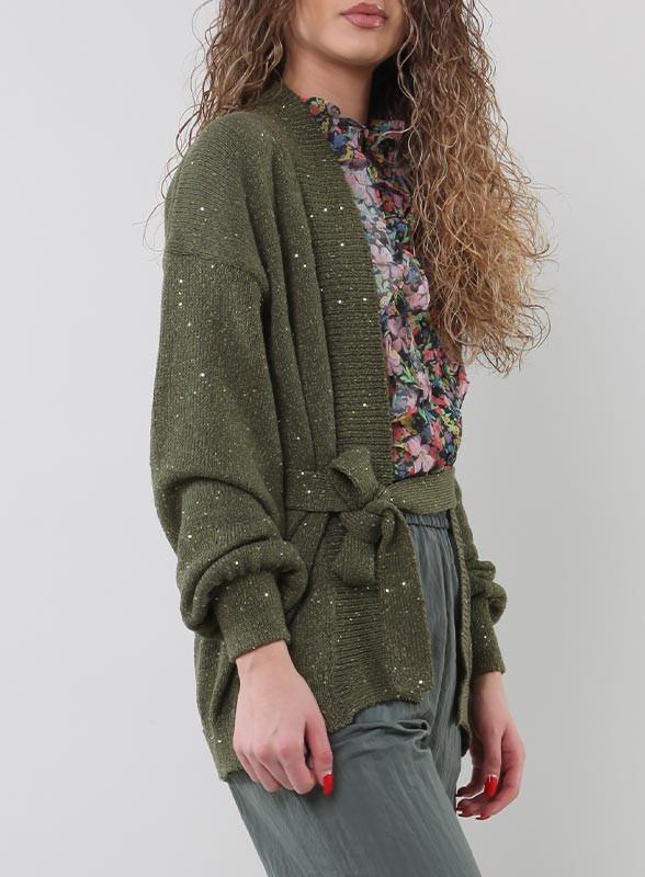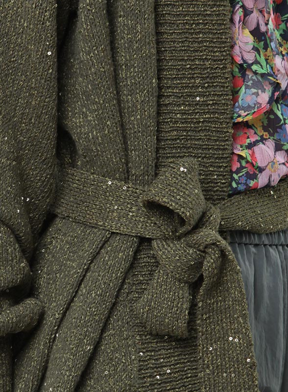Cardigan firmato Kontatto: moderno e raffinato, senza bottoni, cinta tono su tono, perfetto per ogni occasione della collezione SS24.
