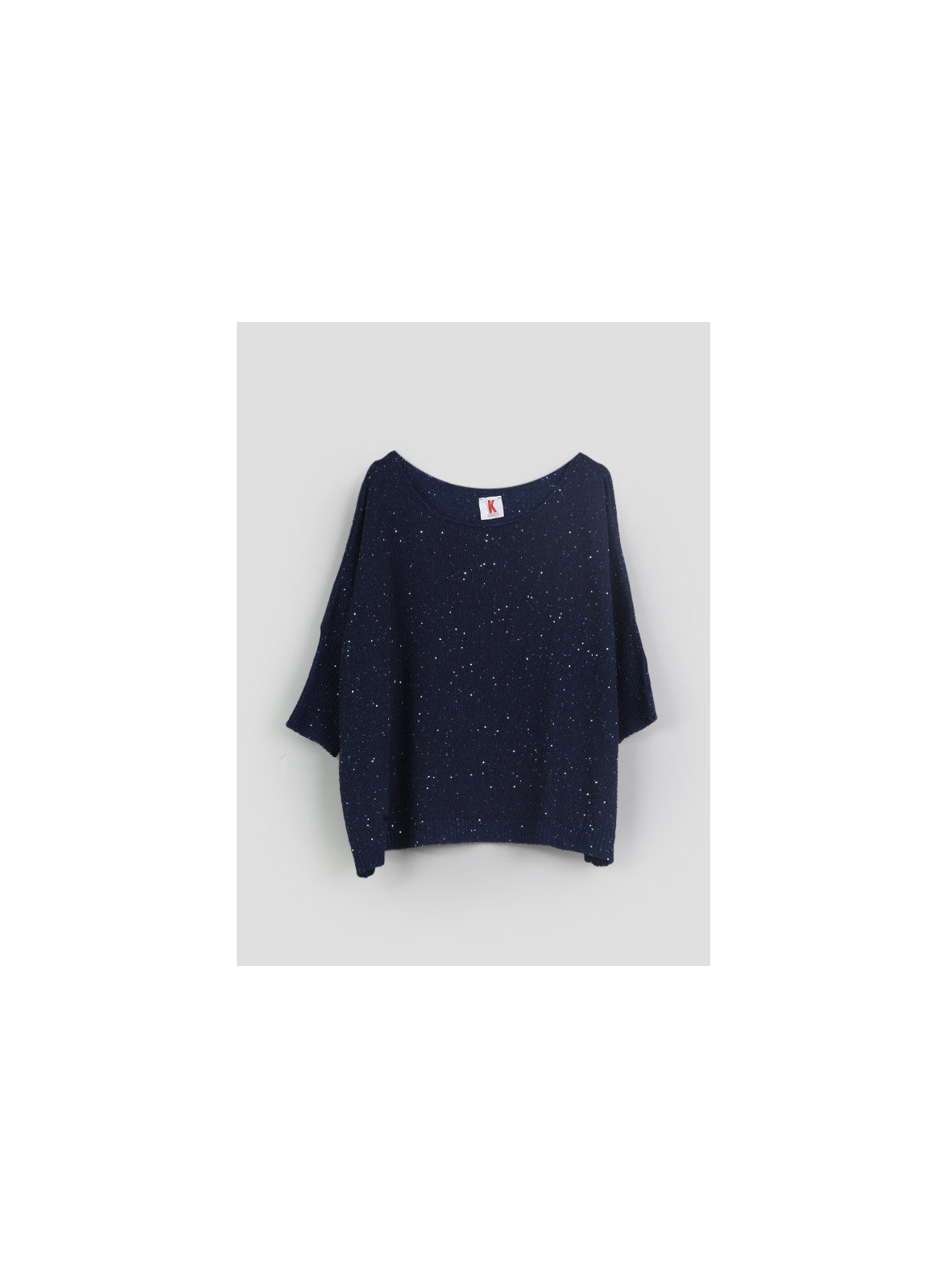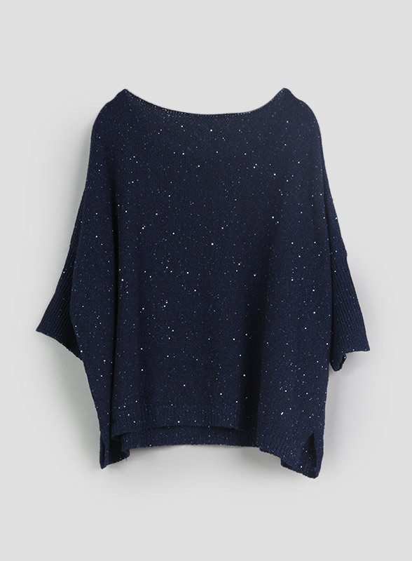 Realizzata con una lavorazione rasata intervallata da paillettes scintillanti, questa maglia presenta uno scollo a barca e maniche a 3/4 con polsini alti. Gli spacchetti laterali al fondo aggiungono un tocco di stile alla vestibilità over, perfetta per la donna moderna che desidera coniugare praticità e design.