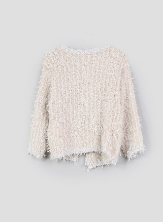 Realizzato in maglia fluffy, offre una silhouette cropped per un look contemporaneo. Il design presenta una linea dritta con scollo rotondo e maniche a tre quarti con giro sceso, garantendo comfort e movimento. Dotato di chiusura a gancio al collo, è parte della collezione Marella MONOCHROME, caratterizzata da silhouette monocolore e materiali pregiati.