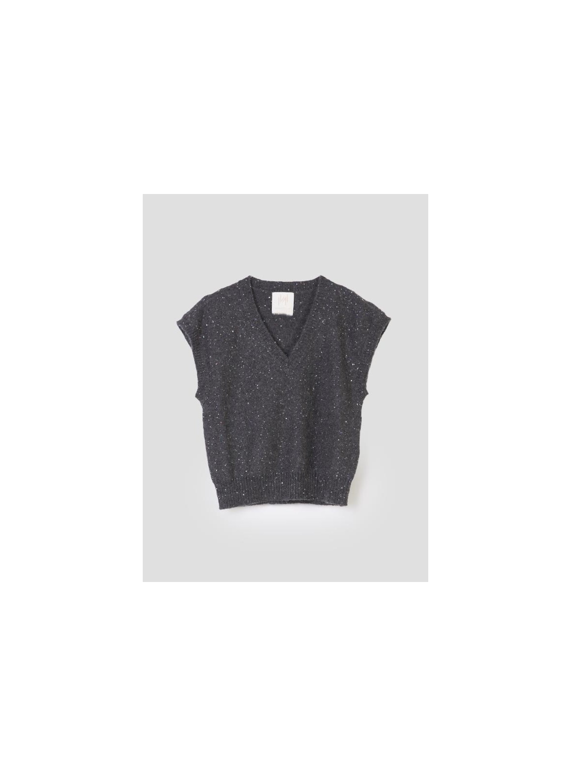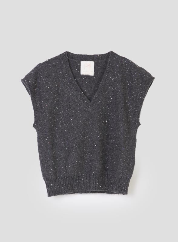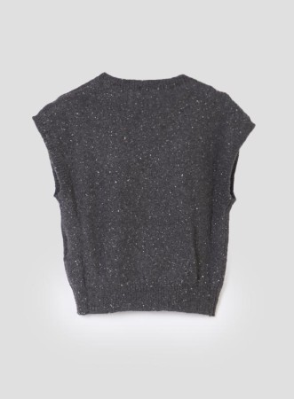 Gilet firmato MARELLA realizzato in misto cachemire, dal design elegante e contemporaneo. Il capo presenta uno scollo a V e una linea senza maniche arricchita da delicate applicazioni di paillettes piatte, che donano luminosità discreta e sofisticata. I bordi del collo e il giro maniche sono rifiniti con una lavorazione a costine, per un tocco di cura sartoriale e comfort. La vestibilità regolare lo rende versatile, perfetto sia per look casual chic che per outfit più ricercati. Questo capo fa parte della collezione MARELLA MONOCHROME.