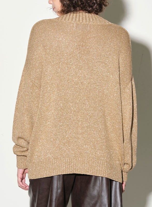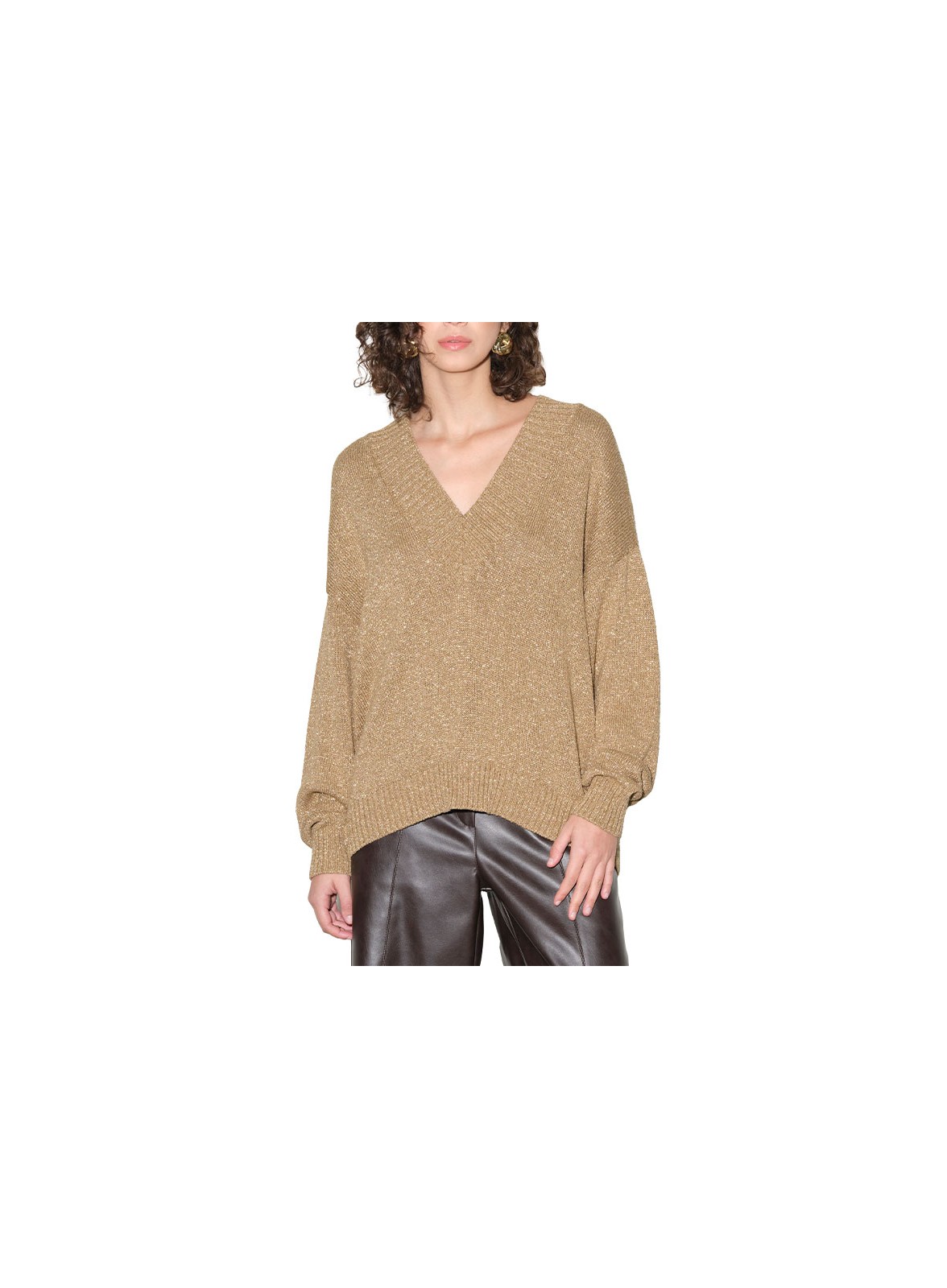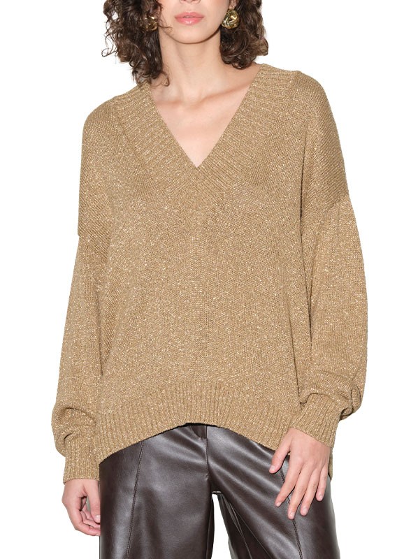 Maglia firmata KAOS con scollo a V, manica lunga e vestibilità over. Lurex luminoso per un capo elegante e versatile.
