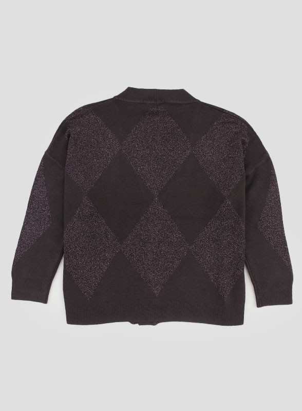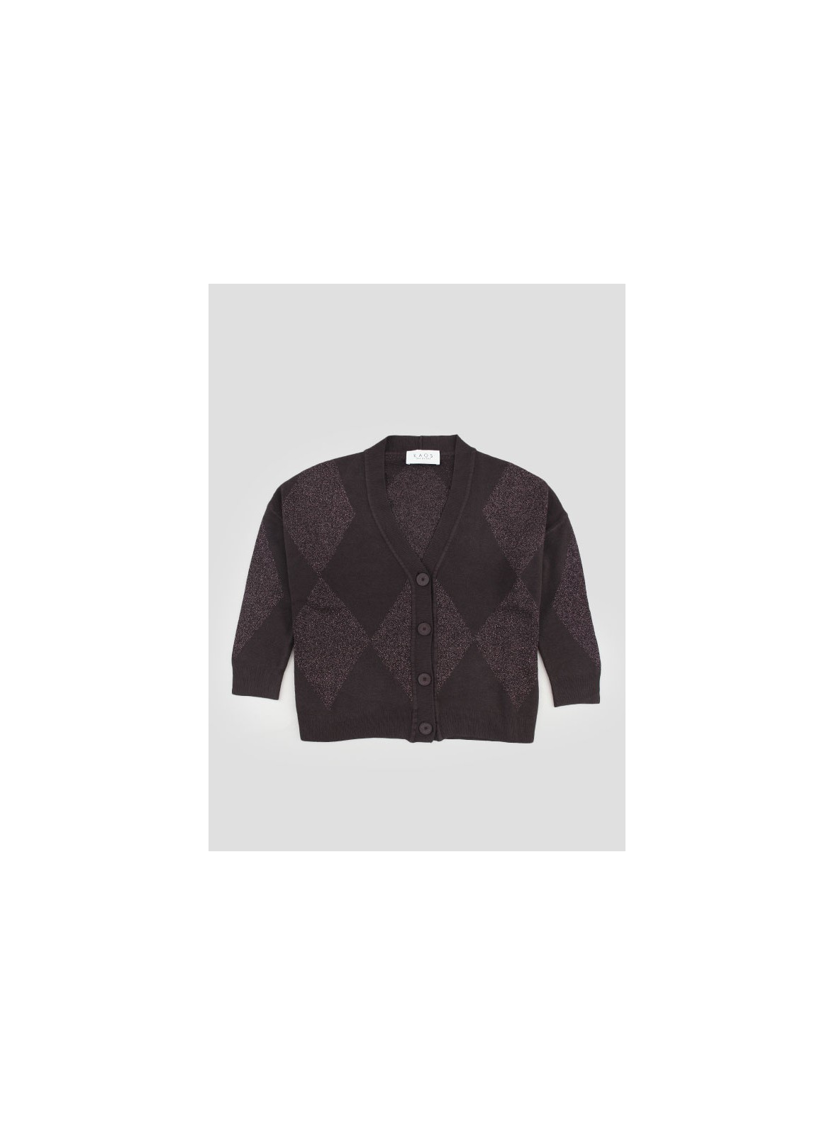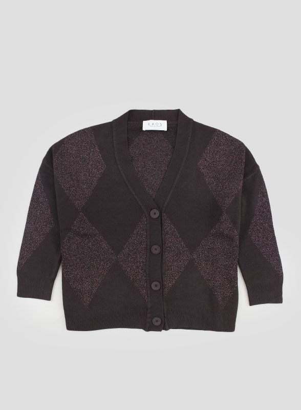 Cardigan firmato KAOS in lurex con bottoni in tinta, manica lunga e vestibilità morbida. Stile raffinato e contemporaneo.