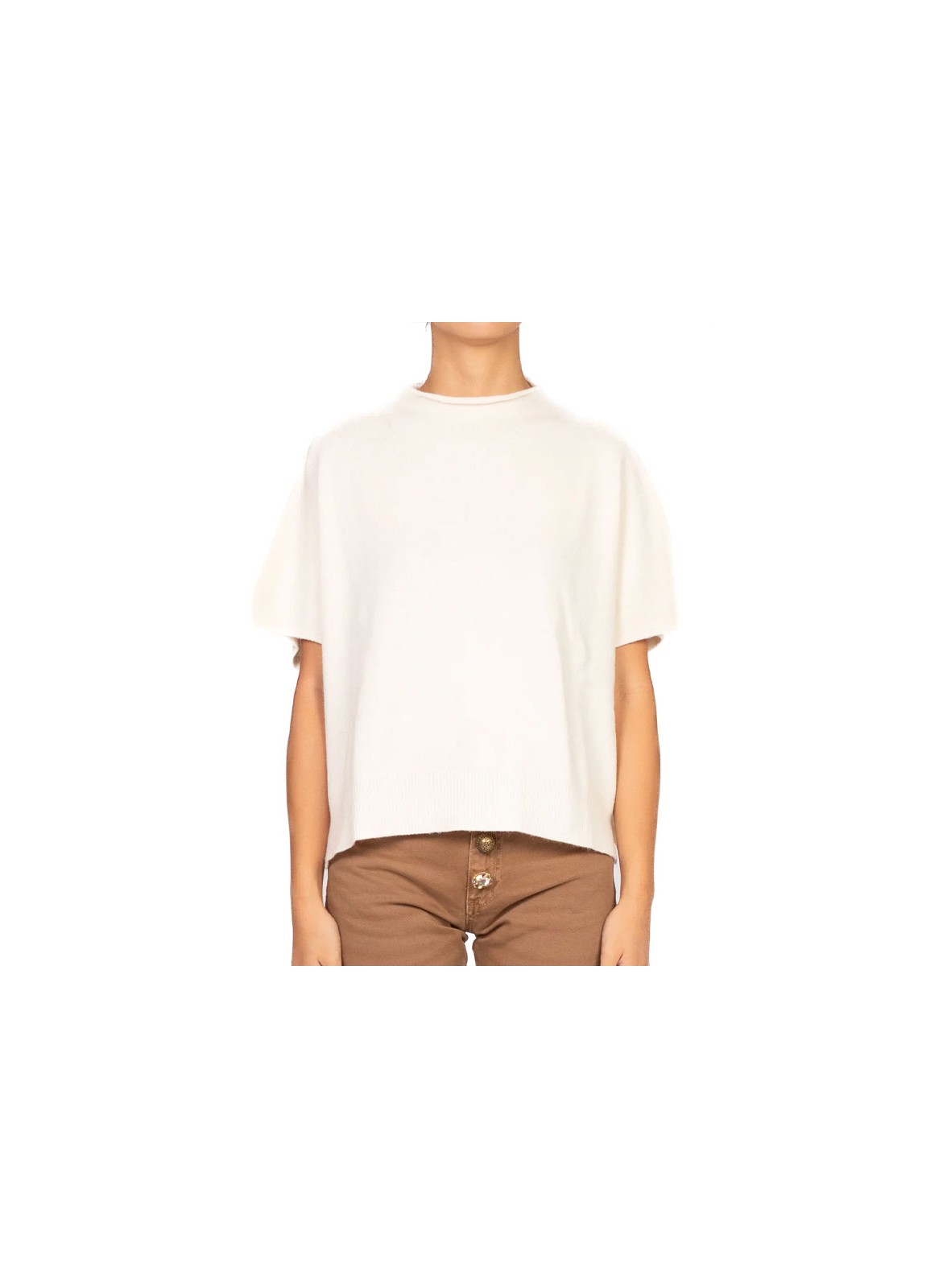 Maglia firmata Kontatto dal fit over e maniche al gomito, scollo a barca con profili a costine sottili, pratica e moderna.