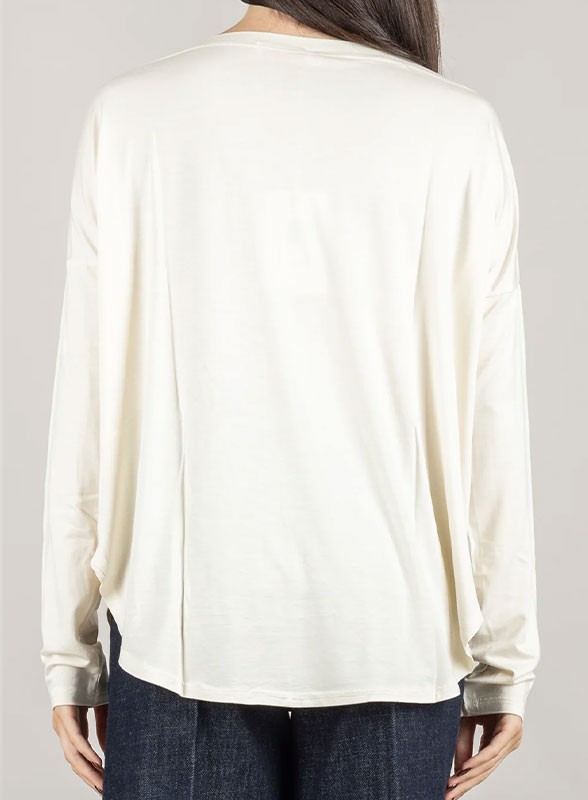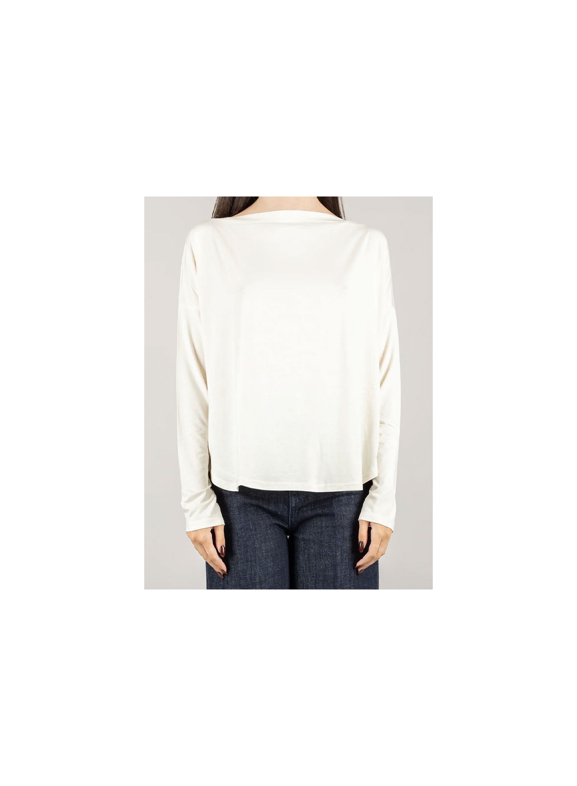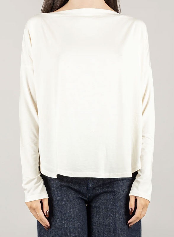 Blusa firmata KONTATTO dalle linee fluide e raffinate, con scollo a barchetta e maniche lunghe, perfetta per look eleganti e versatili.