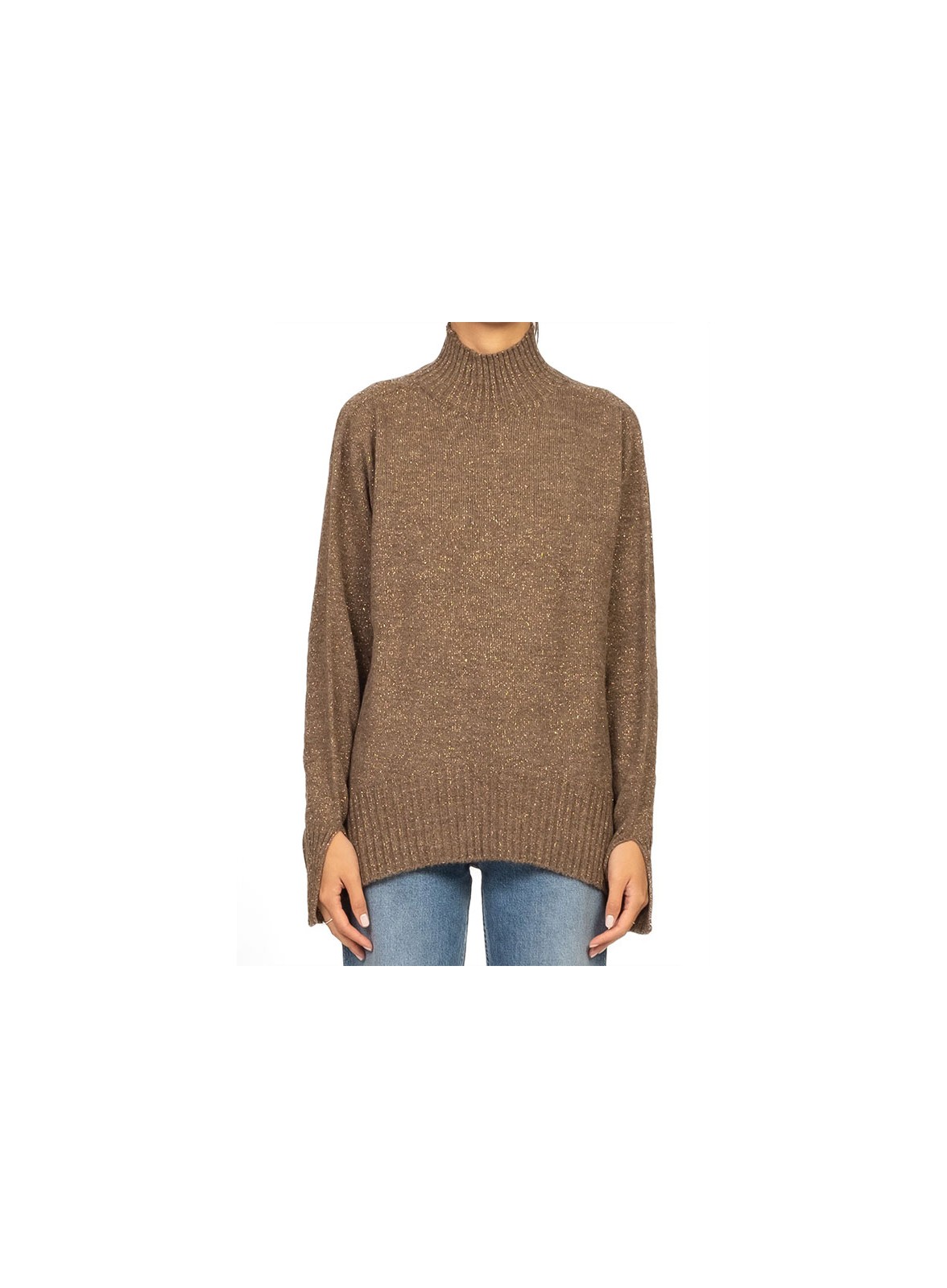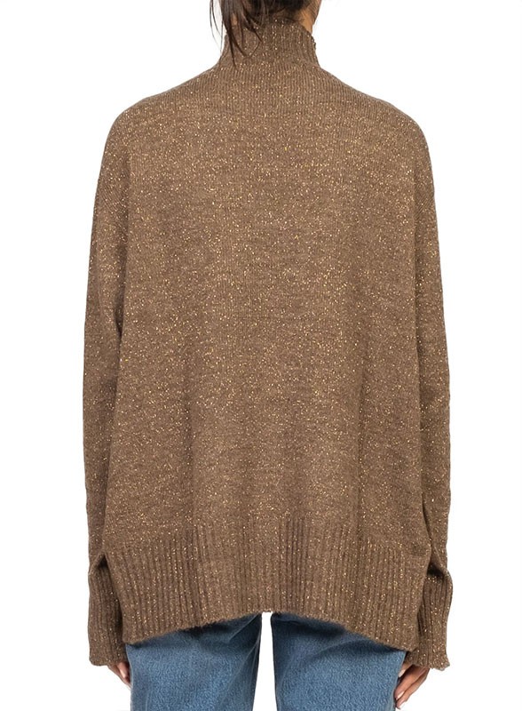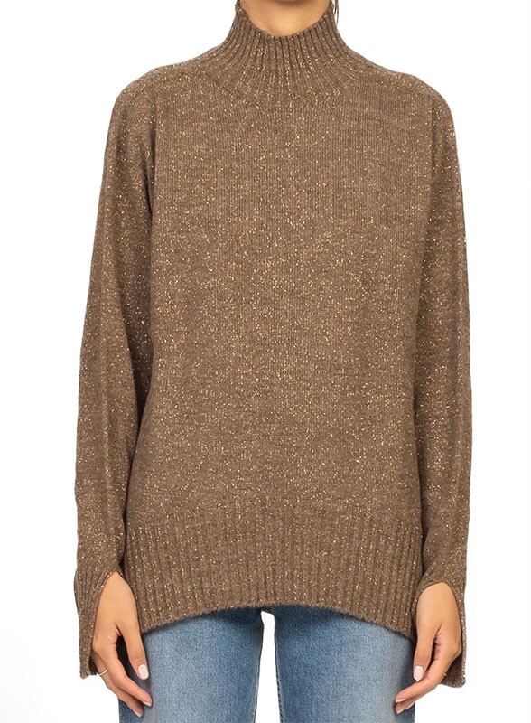Maglia lunga firmata KONTATTO, essenziale e luminosa grazie al lurex, perfetta per look casual o raffinati con un tocco femminile.