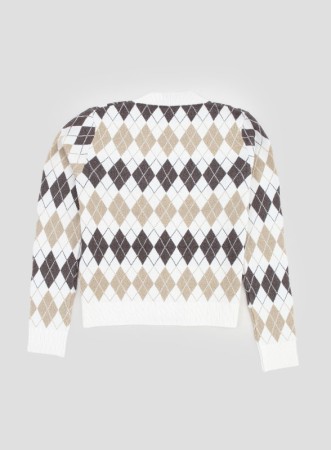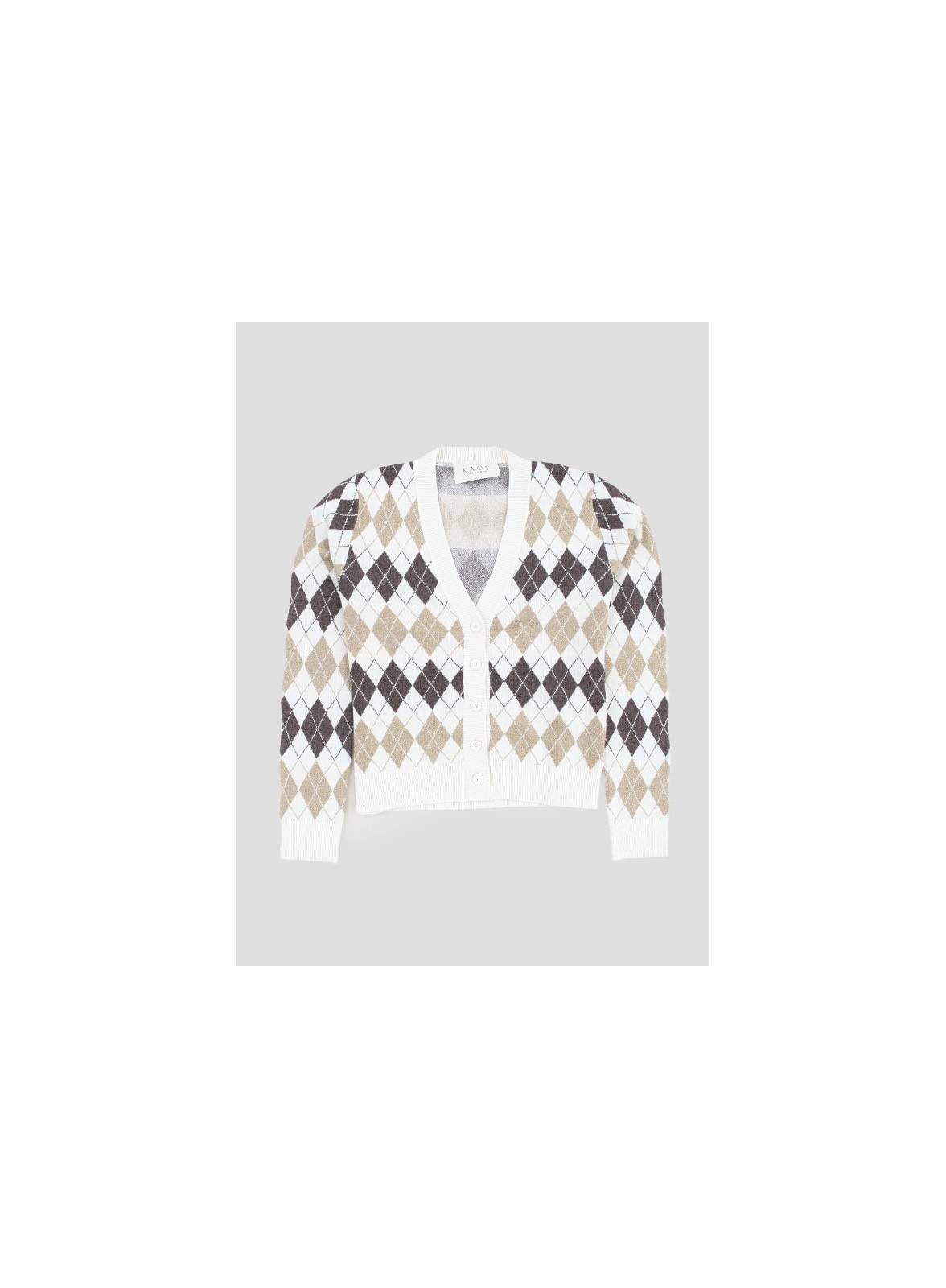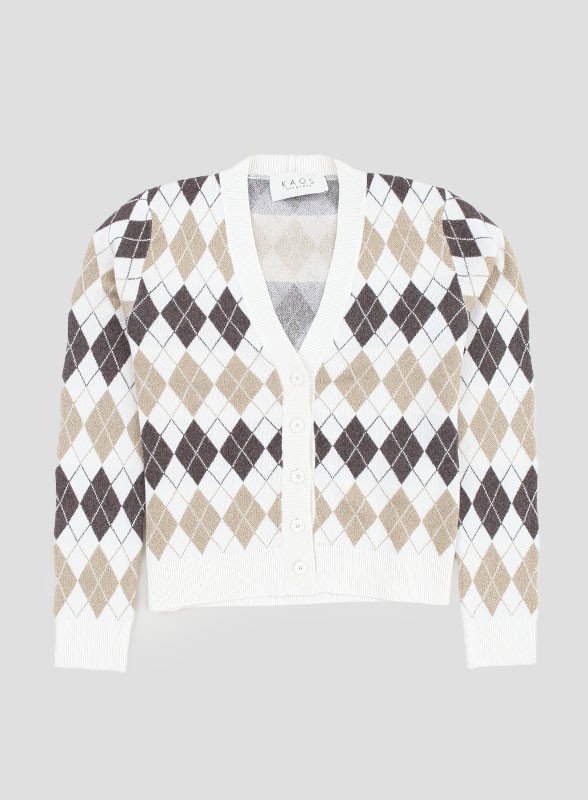Maglia firmata KAOS, giacchino con scollo a V e lavorazione a rombi lurex, elegante e raffinato, fit regolare.