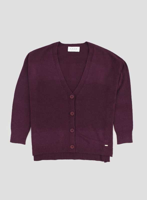 Cardigan firmato KAOS, morbido e avvolgente, con scollo a V e chiusura con bottoni tono su tono. Vestibilità comoda e stile raffinato.