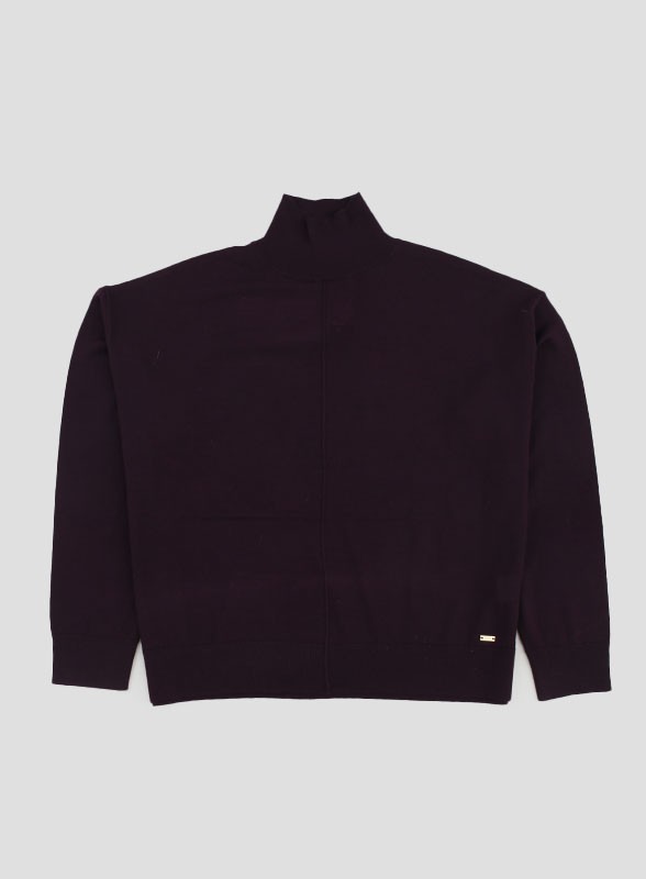 Maglia firmata KAOS con collo ad imbuto in lana merinos, manica lunga e vestibilità over. Stile moderno e raffinato per look versatili.