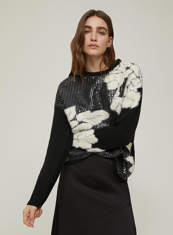 Maglia firmata PENNYBLACK in lana con intarsio jacquard e paillettes. Linea dritta e moderna, per uno stile raffinato e luminoso.