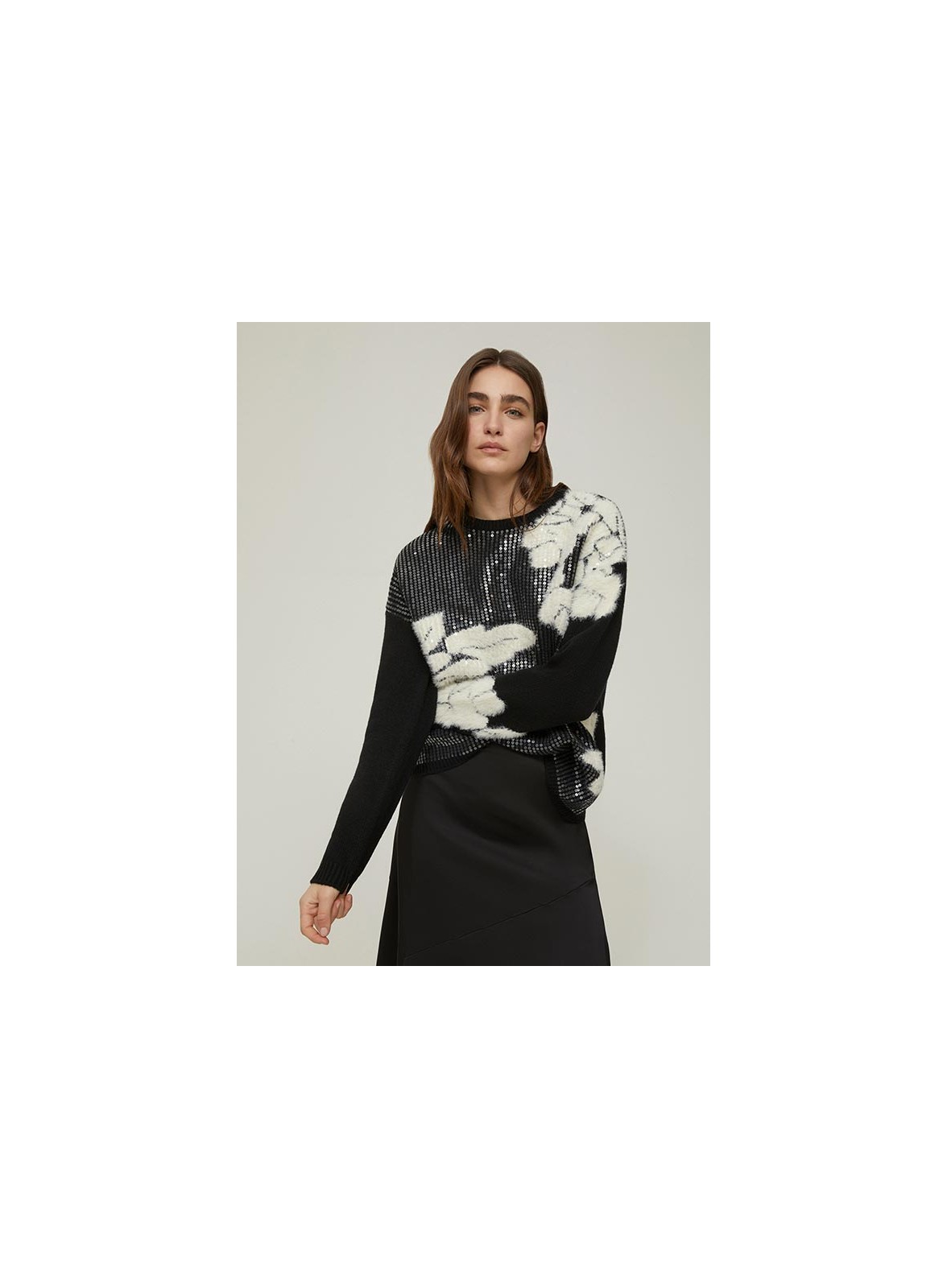 Maglia firmata PENNYBLACK realizzata in un pregiato filato misto lana, caratterizzata da una lavorazione a intarsio jacquard arricchita da delicate paillettes trasparenti ricamate sul davanti. Il design presenta un elegante collo a giro e una spalla scesa che conferisce un tocco di morbidezza e comfort alla vestibilità. I bordi lavorati a costine aggiungono struttura al capo, mantenendo una linea ampia e dritta che valorizza ogni silhouette.