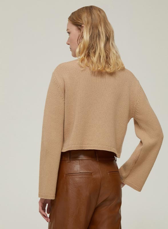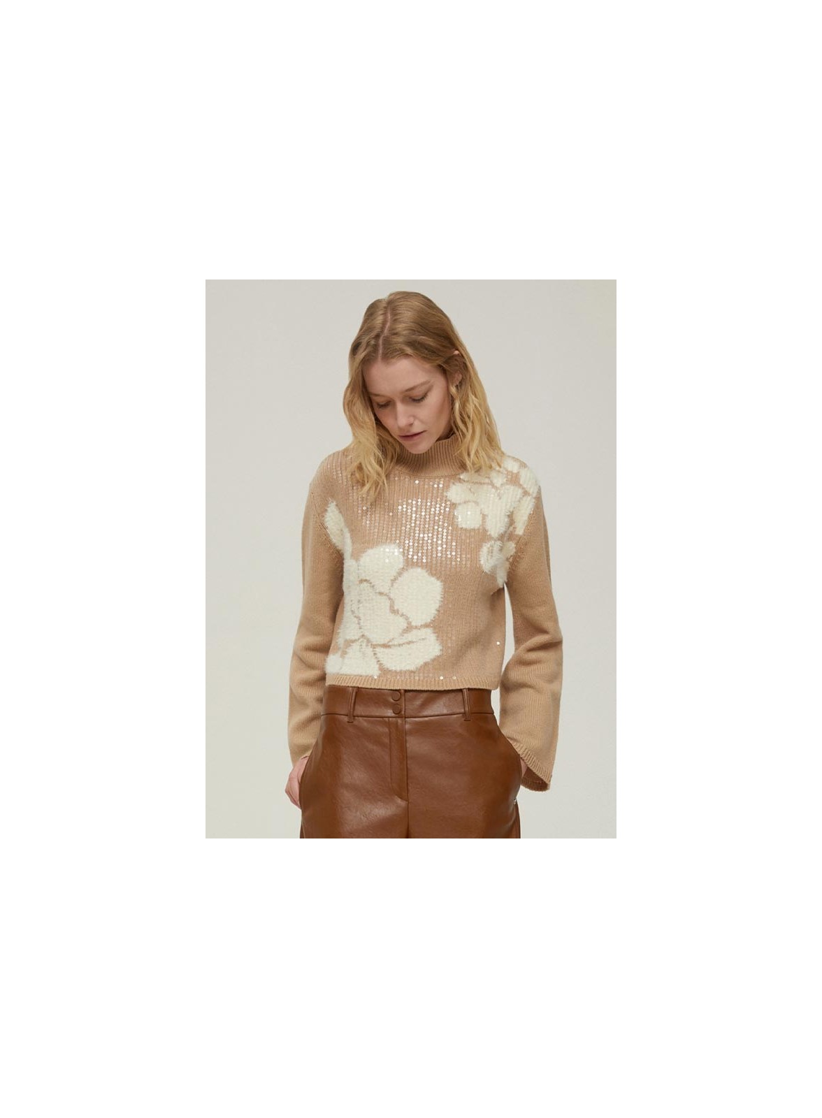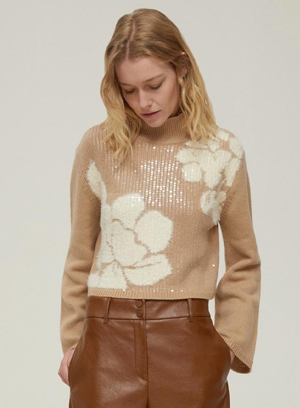 Maglia firmata PENNYBLACK in lana con lavorazione jacquard e paillettes trasparenti. Collo alto e maniche svasate per un look raffinato.