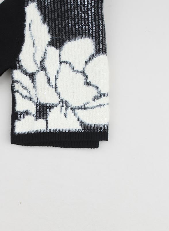 Maglia firmata PENNYBLACK realizzata in un pregiato filato di lana con lavorazione a intarsio jacquard che dona movimento e personalità al capo. Il design è arricchito da delicate paillettes trasparenti ricamate sul davanti, per un effetto luminoso e sofisticato senza rinunciare alla morbidezza del tessuto. Il collo alto con spalla scesa e le maniche leggermente svasate creano una linea femminile e contemporanea, ideale per completare look eleganti o casual chic. I bordi sono rifiniti a coste per garantire una perfetta vestibilità e una tenuta ottimale nel tempo.