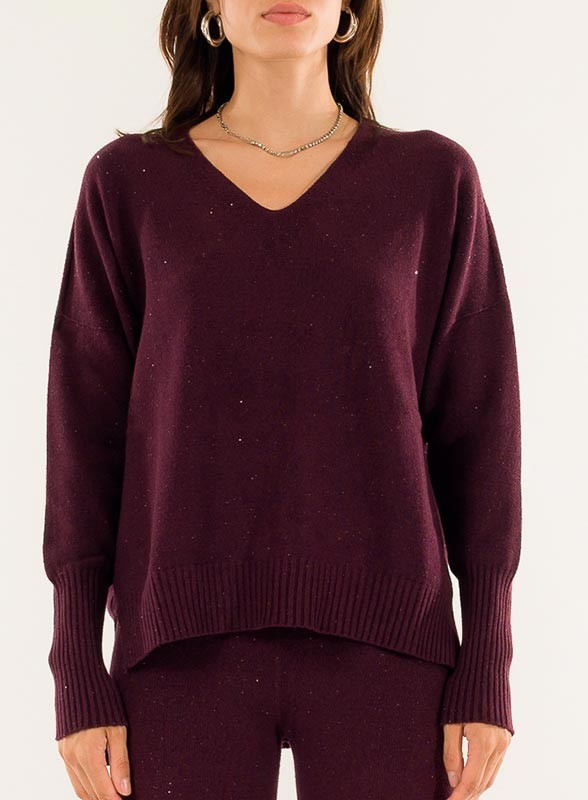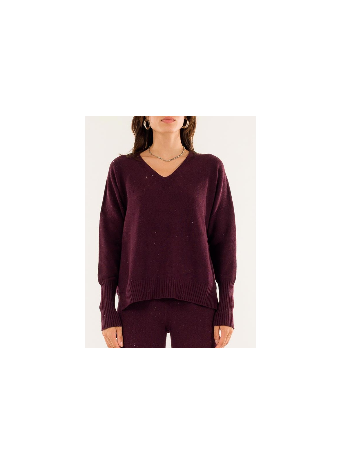 Maglia firmata KONTATTO dal fit rilassato e morbido, scollo a V raw e polsini a coste. Versatile e confortevole per ogni occasione.