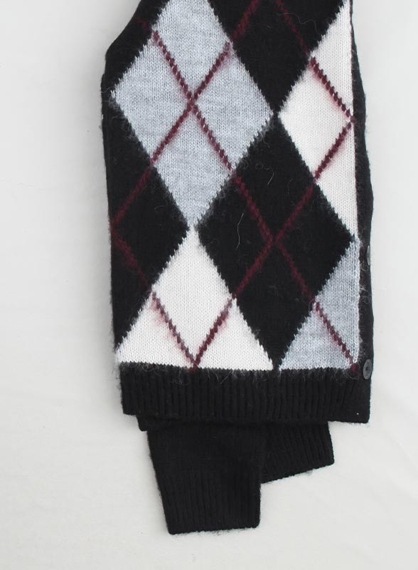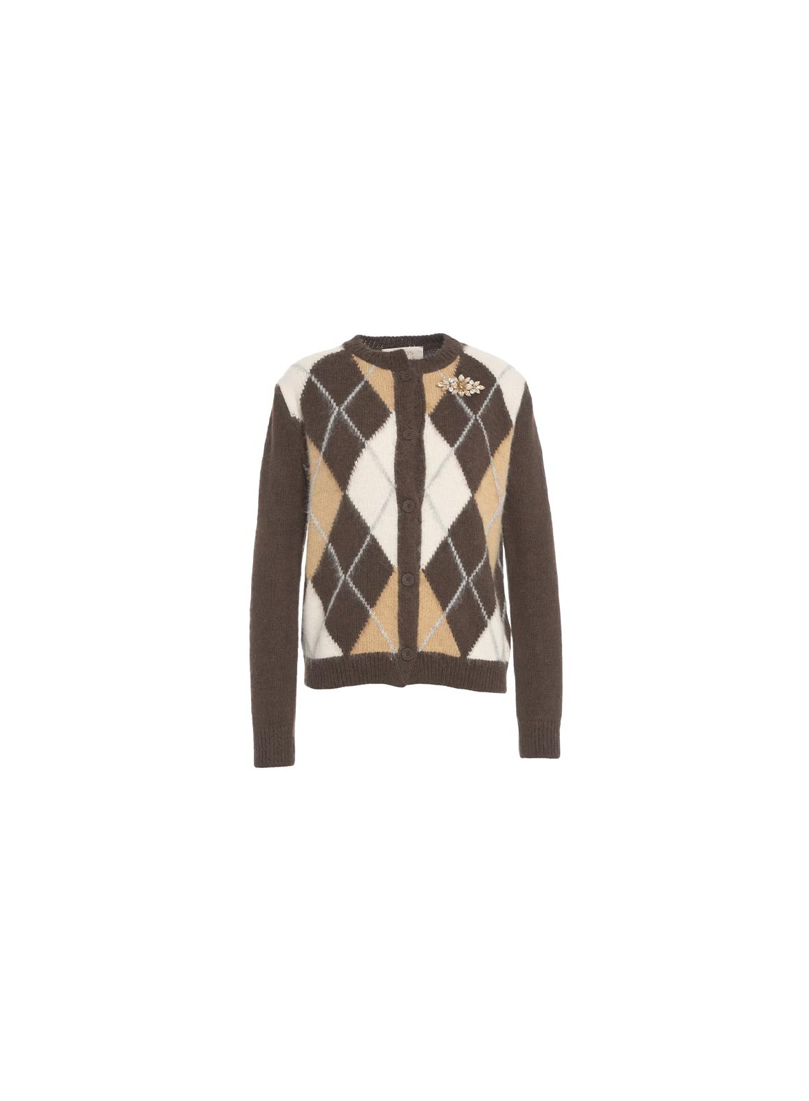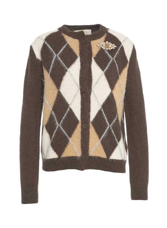 Cardigan firmato KAOS in maglia jacquard con motivo a rombi, chiusura con bottoni e spilla sul petto. Eleganza e comfort in un solo capo.