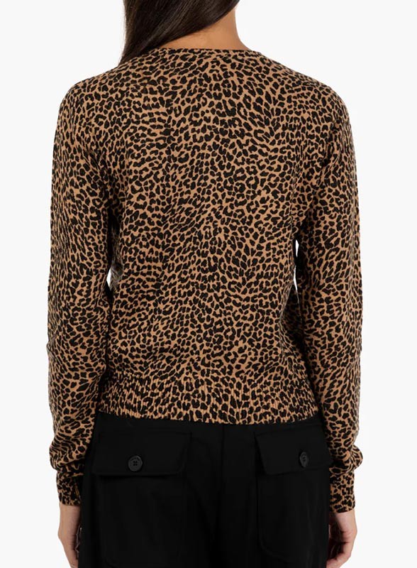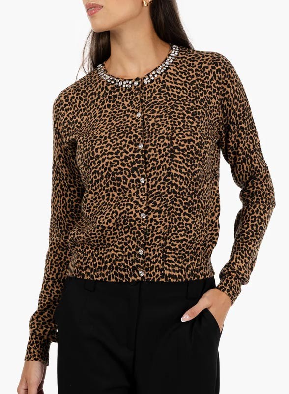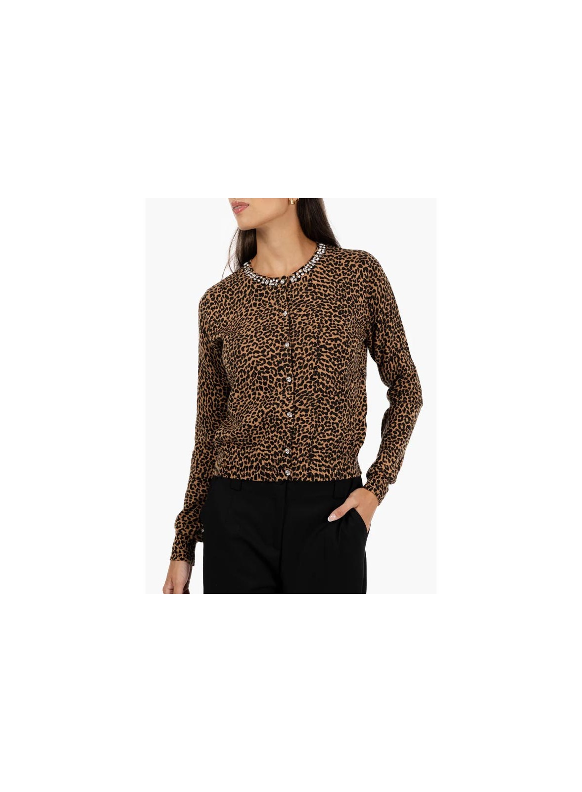 Cardigan firmato KAOS in fantasia animalier con strass sul collo e bottoni gioiello. Eleganza e comfort in un fit regolare.