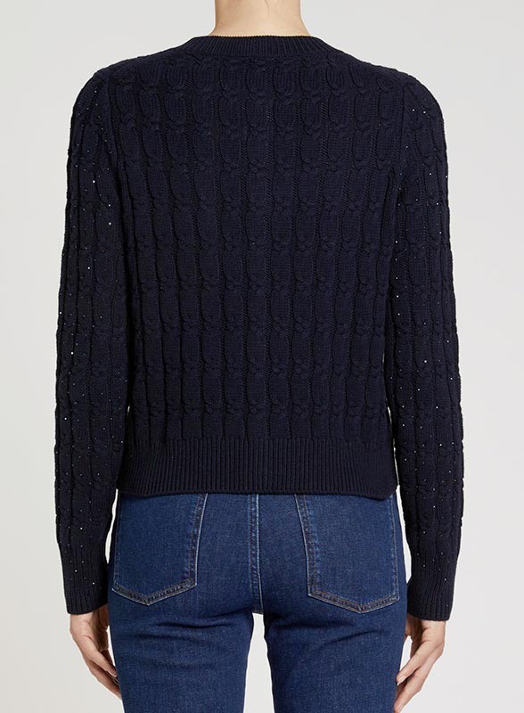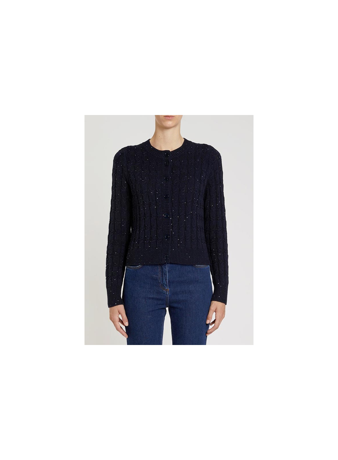 Cardigan firmato PENNYBLACK con lavorazione a trecce e micro-strass luminosi, fit regolare e taglio sopra i fianchi, perfetto per look raffinati quotidiani.