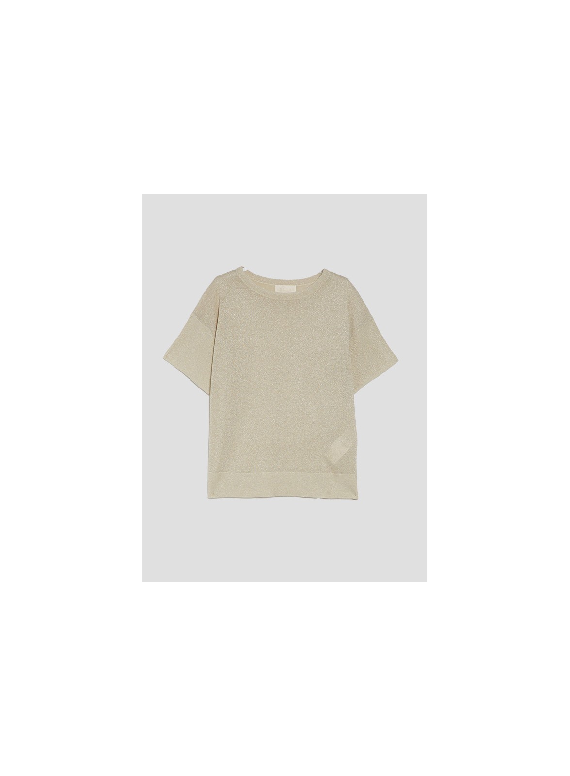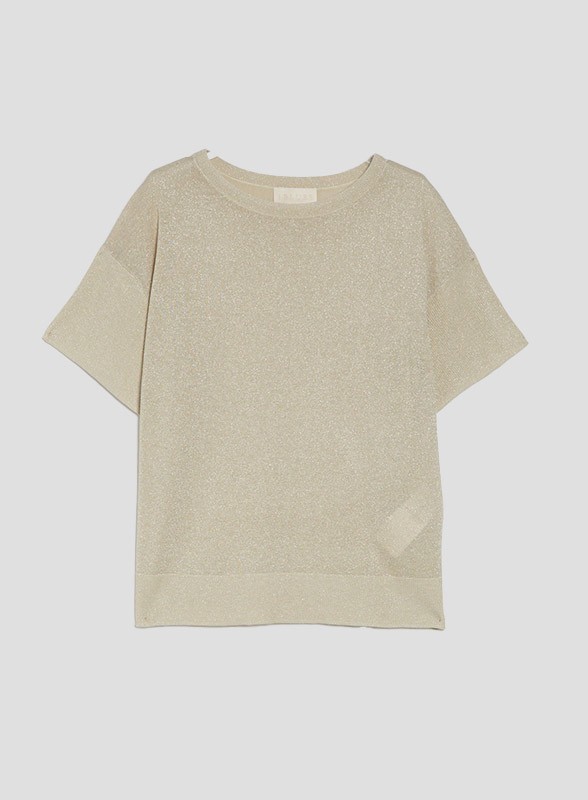 Maglia firmata IBLUES in misto seta lurex, linea ampia con scollo a barchetta e manica corta, disponibile in più varianti colore.