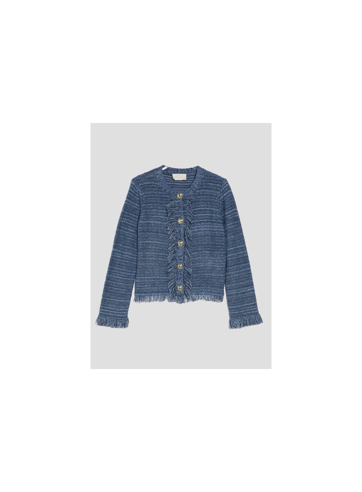 Cardigan firmato IBLUES in misto cotone lurex, linea boxy con frange e bottoni, perfetto per un look moderno e luminoso.