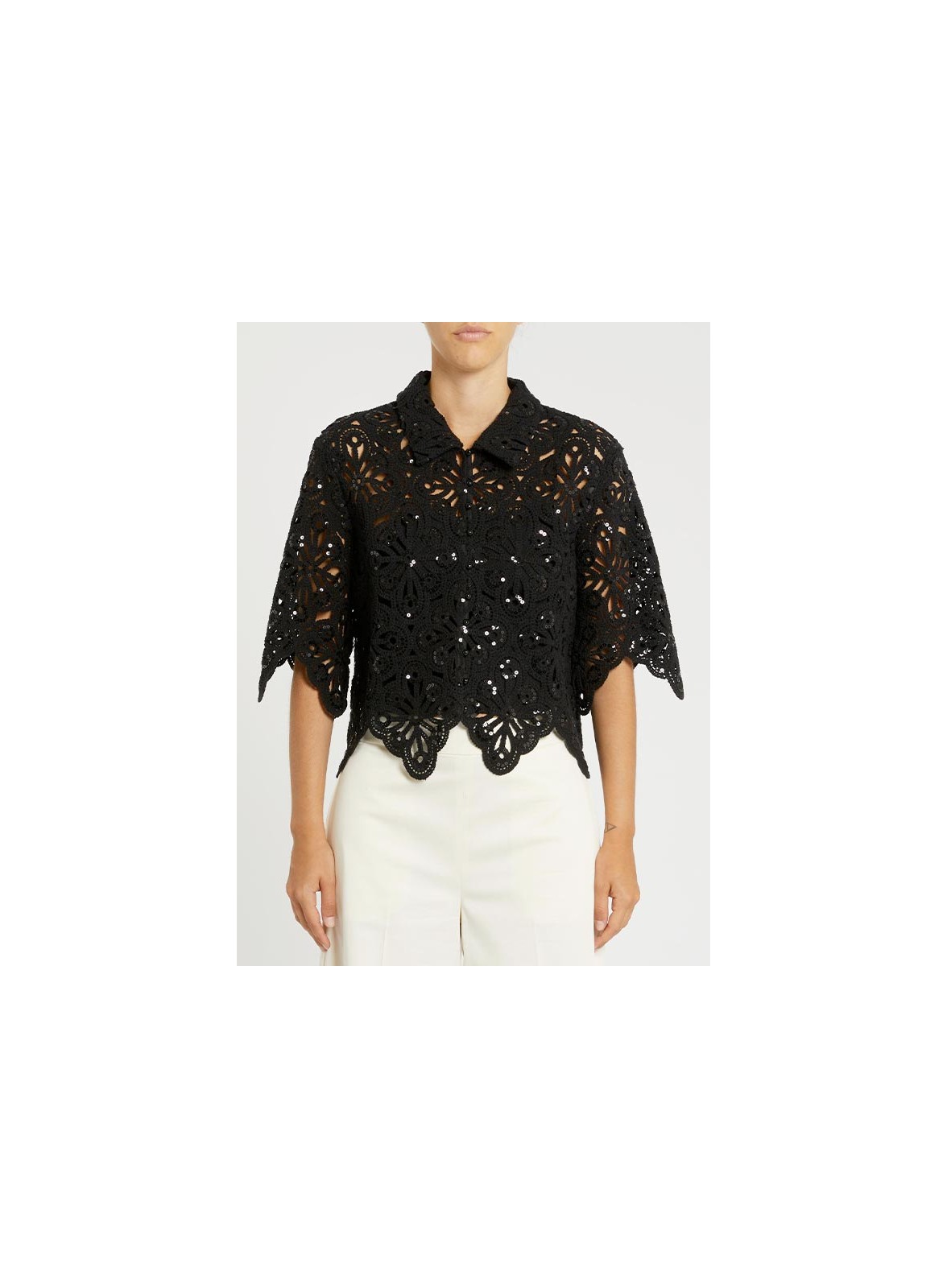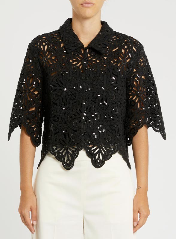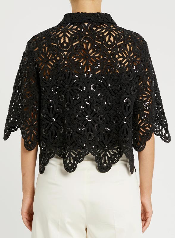 Polo firmata PENNYBLACK in jersey effetto macramè con paillettes, taglio boxy e dettagli raffinati per un look estivo boho glam.
