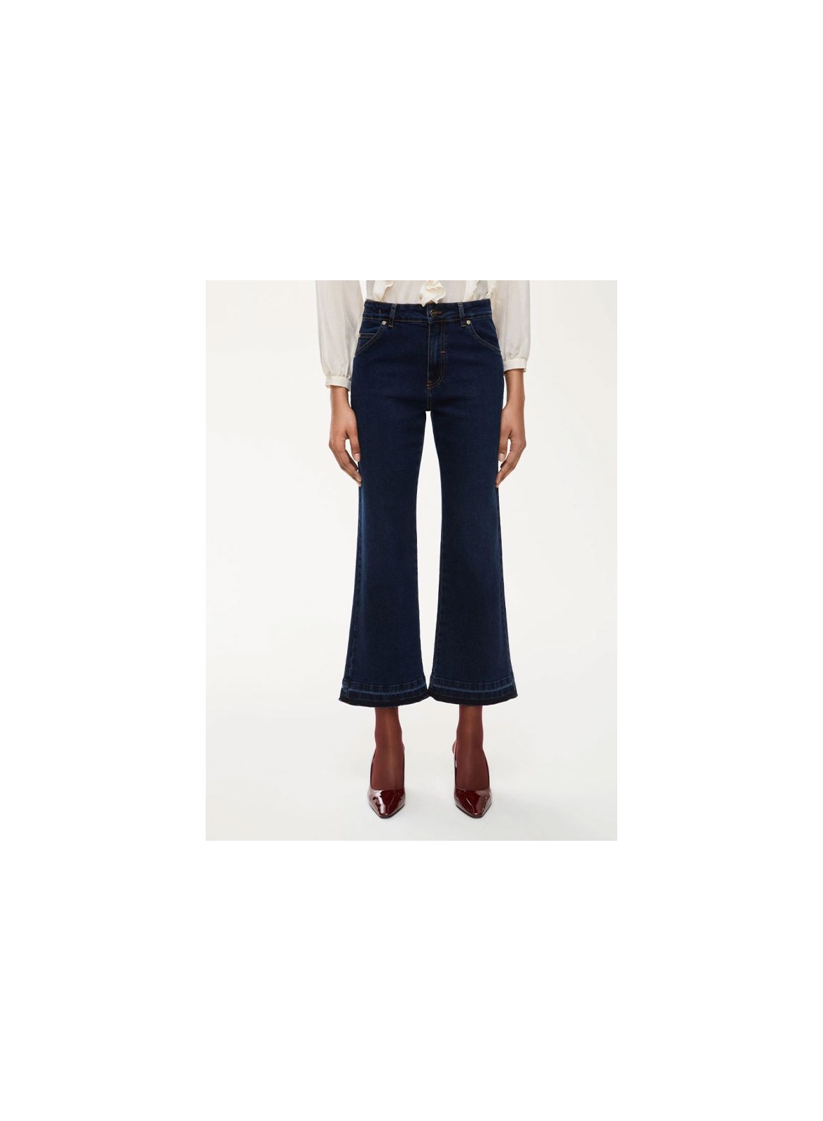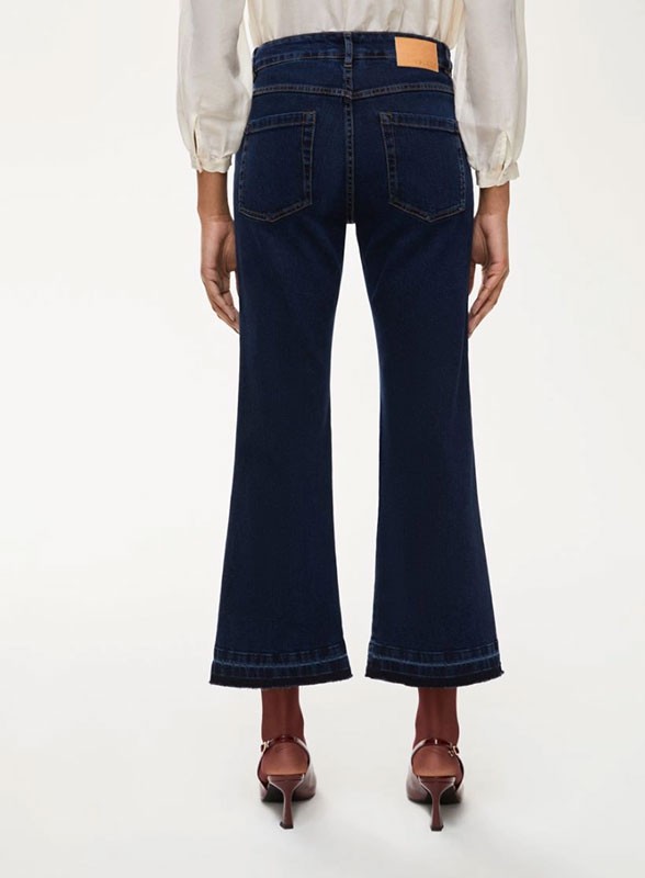 Jeans cinque tasche firmati IBLUES in denim stretch, linea flare con orlo sfrangiato. Sostenibili e confortevoli, perfetti per ogni occasione.