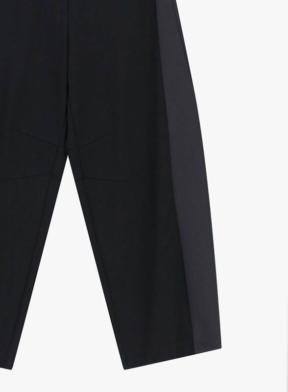 Pantalone a gamba larga firmato NENETTE, in fresco lana stretch con inserti in ottoman. Eleganza e comfort per un look raffinato e moderno.