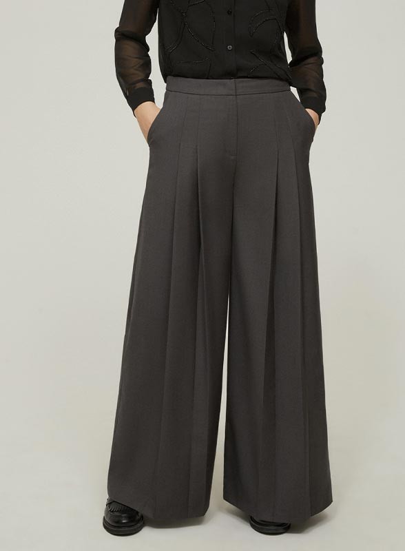 Pantalone firmato PENNYBLACK, realizzato in un raffinato tessuto in blend di viscosa che garantisce comfort e stile in ogni occasione. La linea si distingue per la gamba dalle maxi ampiezze, strutturata da pieghe sul davanti che donano movimento e un’elegante fluidità. Sul retro, la piega è stirata per mantenere una silhouette impeccabile. Le tasche alla francese sul davanti e a filo sul retro aggiungono un tocco di praticità senza rinunciare all’eleganza. La chiusura è con zip e gancio nascosti, per un finish pulito e discreto.