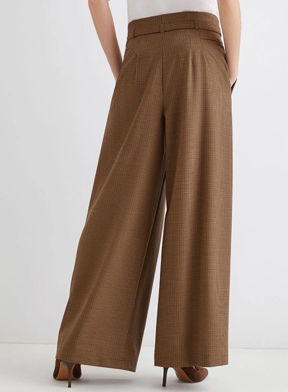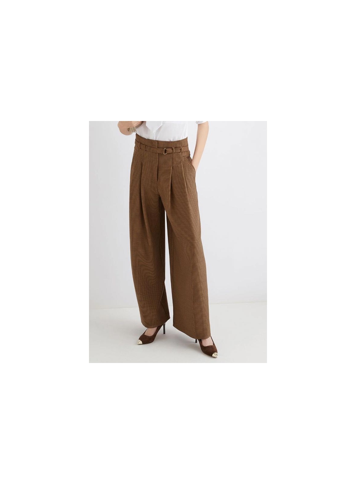 Pantalone firmato MARELLA in tessuto diagonale stretch, vita alta e fit ampio con cintura a doppio anello. Eleganza e comfort quotidiano.