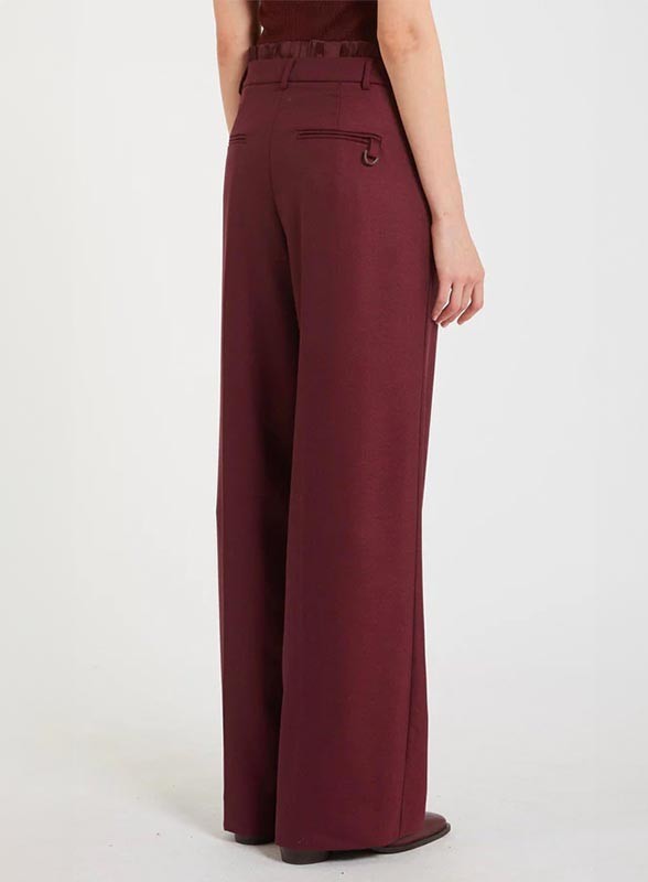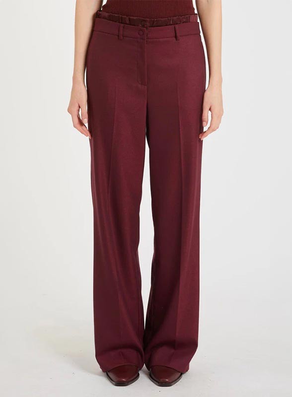 Pantalone firmato MARELLA, realizzato in pregiato tessuto diagonale misto lana, pensato per offrire un equilibrio perfetto tra eleganza e comfort. Il modello presenta una linea dritta che valorizza la silhouette, adatta sia a un contesto professionale sia a un outfit più formale. La chiusura con bottone a pressione ricoperto dona un tocco raffinato, mentre il dettaglio in raso in vita aggiunge un elemento di sofisticatezza discreta. Le pieghe stirate sul fronte e sul retro slanciano la figura, completate da tasche laterali alla francese e posteriori a filetto che uniscono praticità e stile.