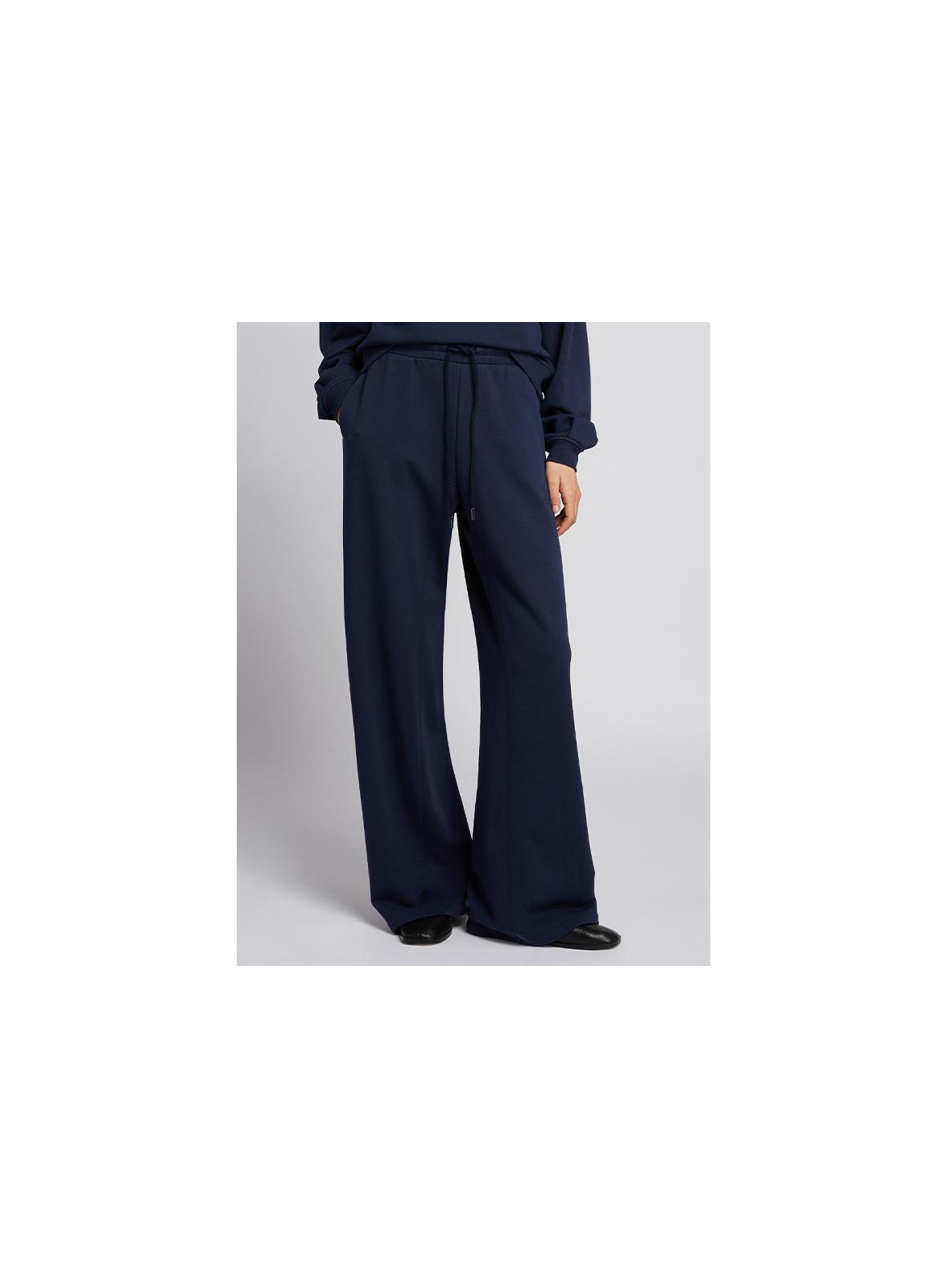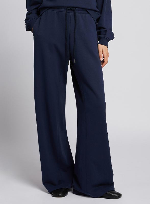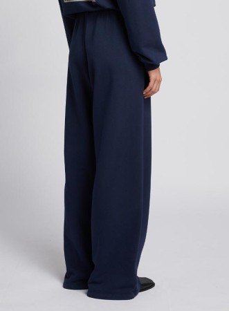 Pantalone firmato MM MAXMARA in jersey punto Milano, linea ampia con vita elasticizzata e coulisse. Disponibile blu.