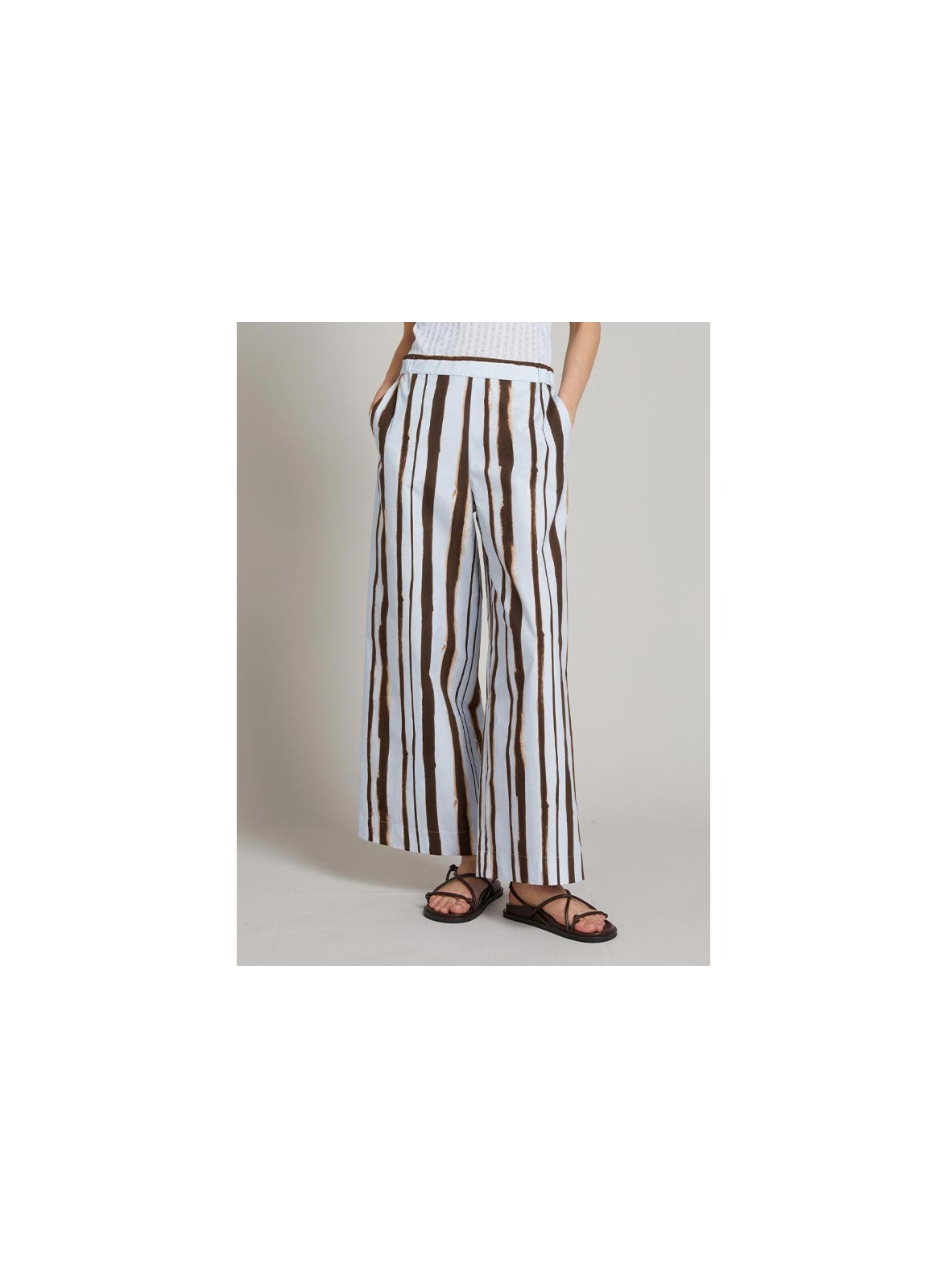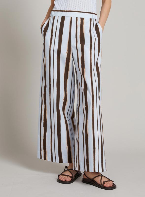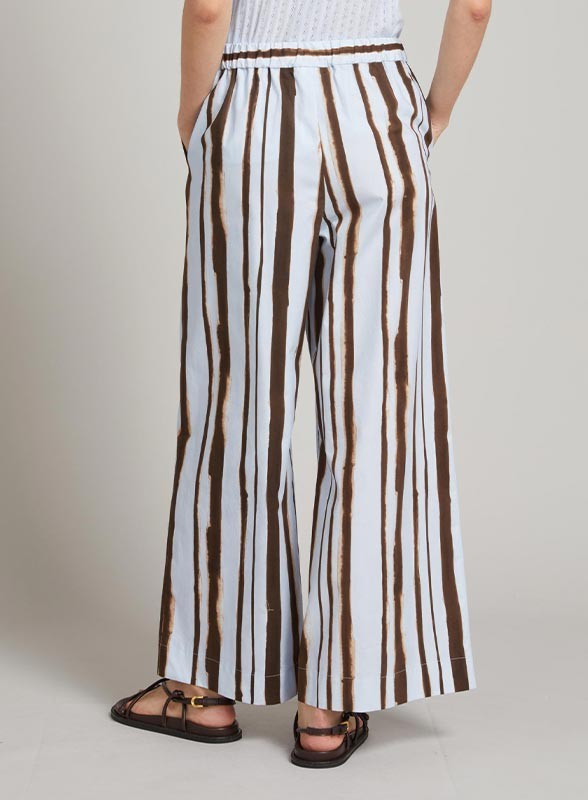 Pantalone wide leg firmato MM MAXMARA in cotone con stampa all over, linea fluida e vita elasticizzata per un comfort elegante.