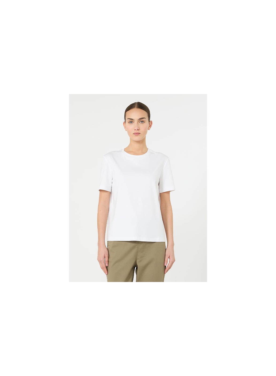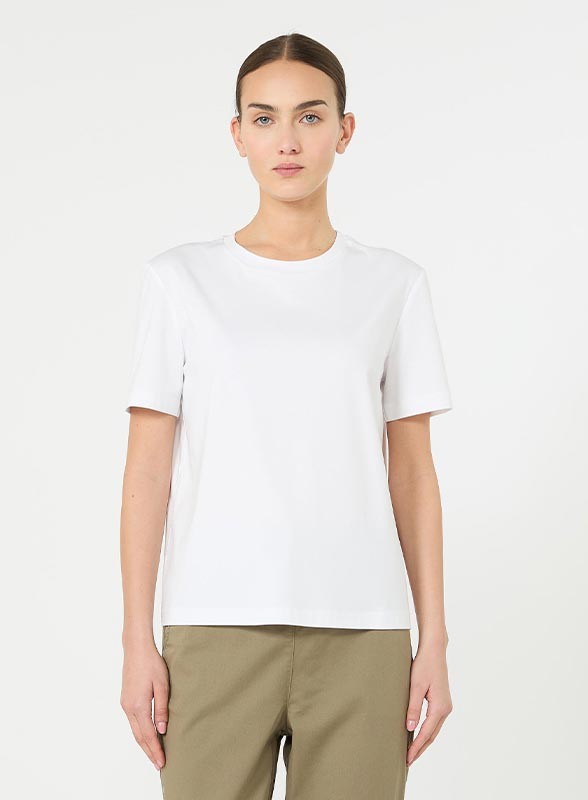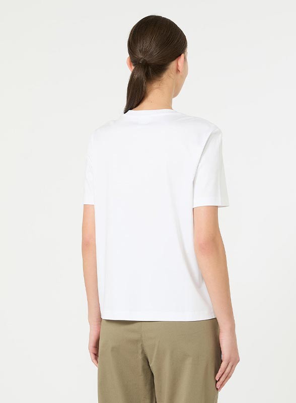 Blusa donna firmata MM MAXMARA in morbido cotone e modal, scollo tondo e logo tono su tono. Stile casual chic, vestibilità regolare.